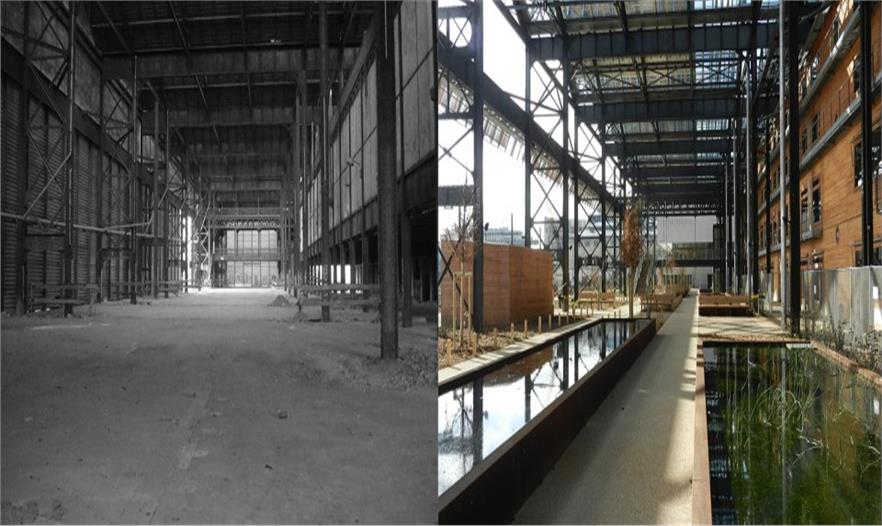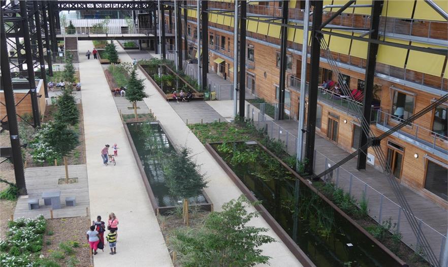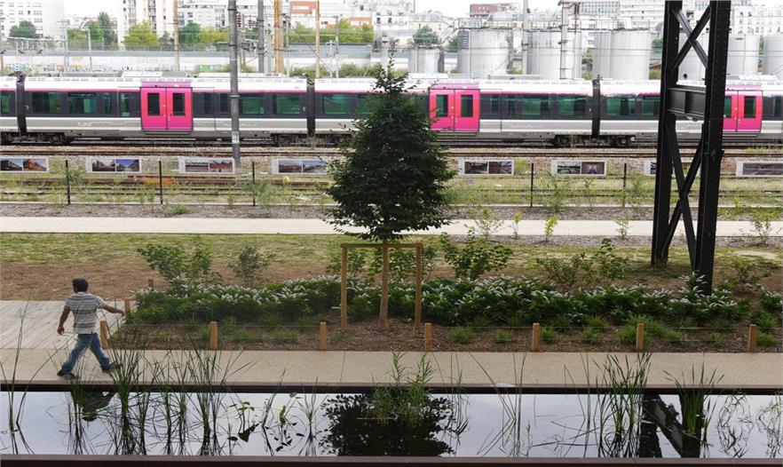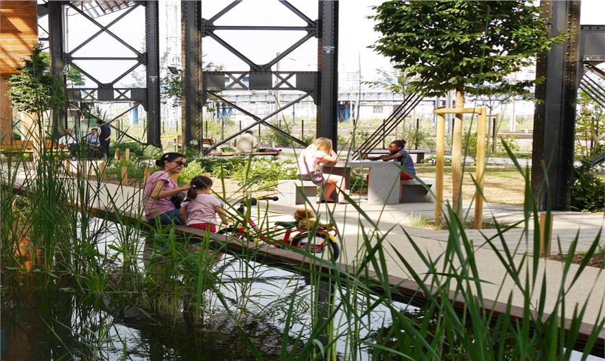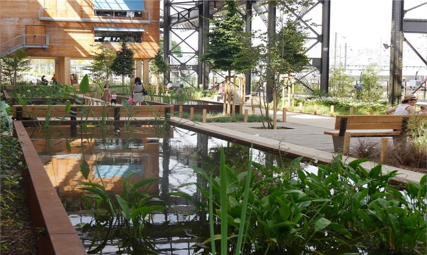 而在南側,Halle Pajol巨大的金屬框架之上,鑲嵌著一塊塊太陽能板,而花園也搖身一變,成為了一個巨大的光伏電站。如同舊日鐵軌般交錯縱橫的小路兩旁,是低矮的地被植被,茂盛的鮮花以及縱向延伸的池塘。屋頂收集的雨水被二次利用,灌溉著頂棚之下的植被,而多余的雨水則被暫時儲存在池塘之中,形成了一個個水生花園。