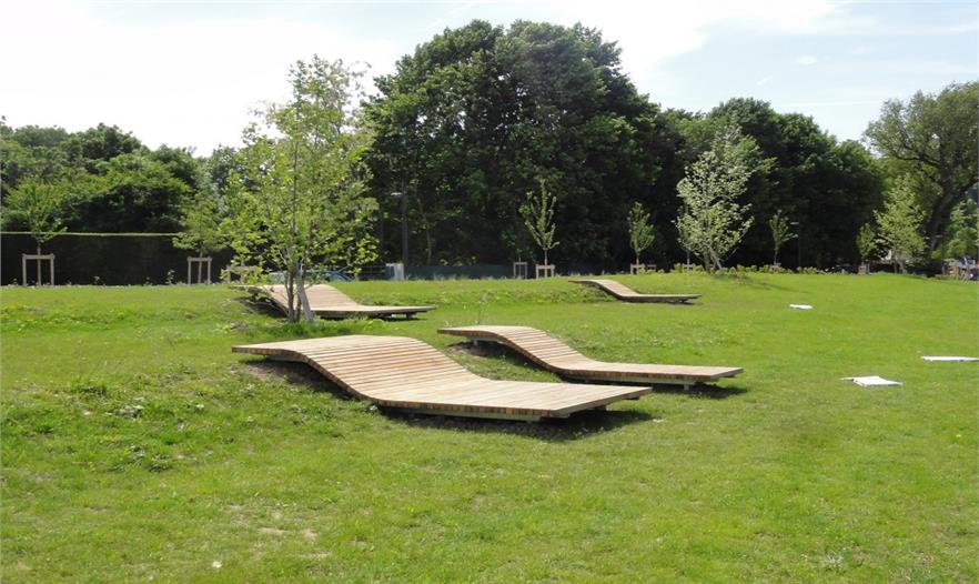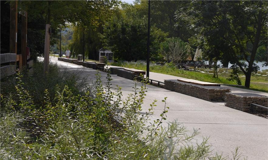 In situ的設(shè)計(jì)寥寥幾筆,便凸顯出空間自有的獨(dú)特氛圍。他們修復(fù)了被洪水所沖垮了河岸空間,在索恩河沿岸打造了一片如同綠色沙灘般的開闊草地。無論是熙熙攘攘的公眾活動(dòng)、露天音樂會抑或多樣化的藝術(shù)表演都可以在此進(jìn)行。清新的空氣,輕撫的微風(fēng)、開闊的視野、成蔭的綠樹、點(diǎn)綴在草地之上的野餐桌椅以及躺椅吸引了絡(luò)繹不絕的游人。沿著河岸延伸、層次分明的路網(wǎng)為行人與騎行者留出了各自的空間,而不時(shí)出現(xiàn)的室外咖啡廳則提供了短暫停留的休息點(diǎn)。