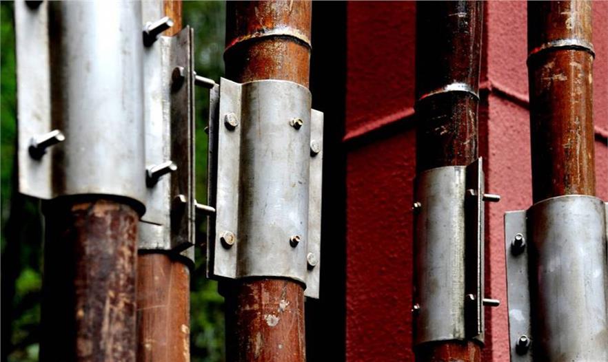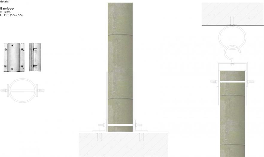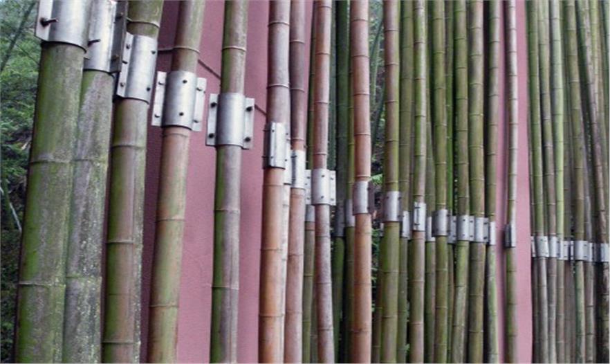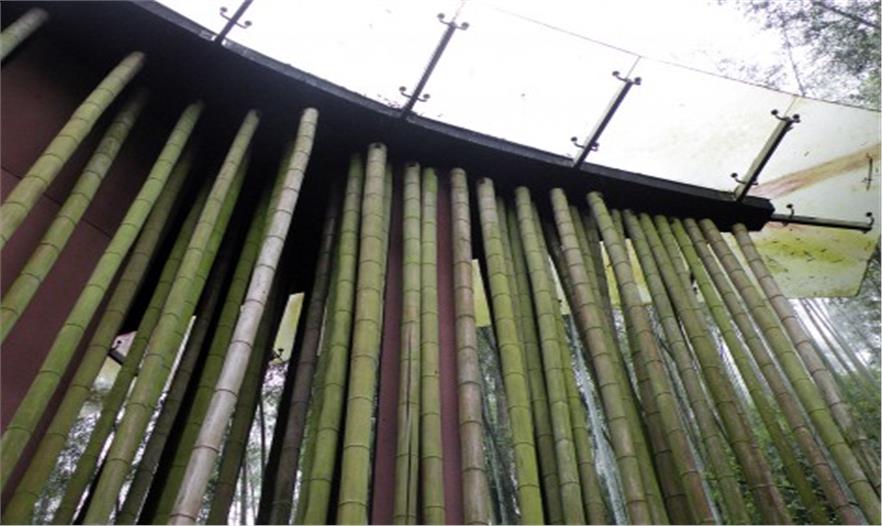 建筑以鋼筋混凝土空腔作為支撐體系,頂板以掛鉤的方式將一群截面直徑在10CM左右、長約11M的竹竿群懸掛其下,雖然頂板+天面玻璃對竹筒群的避雨有一定作用,但竹海濕度大,溫差大,竹桿在這樣的條件下,耐候性是必須重點(diǎn)考慮的因素,同時由于竹體內(nèi)的油系糖水混合物,各類微生物寄生體需用“蒸”的方式排出,否則很容易導(dǎo)致竹腐爛;但當(dāng)?shù)卦O(shè)備只能蒸煮長度在6m內(nèi)的竹竿,于是11m的吊掛高度轉(zhuǎn)化為上下兩截各近5.5m高的竹,二者以手工打造的環(huán)形金屬件垂直連接。