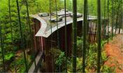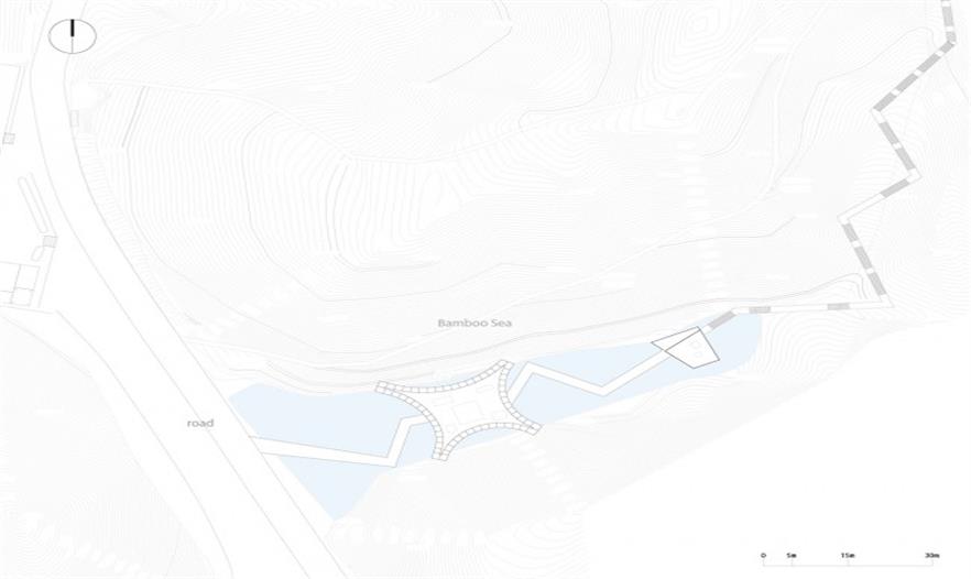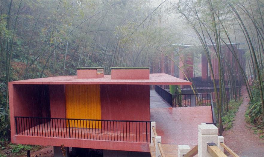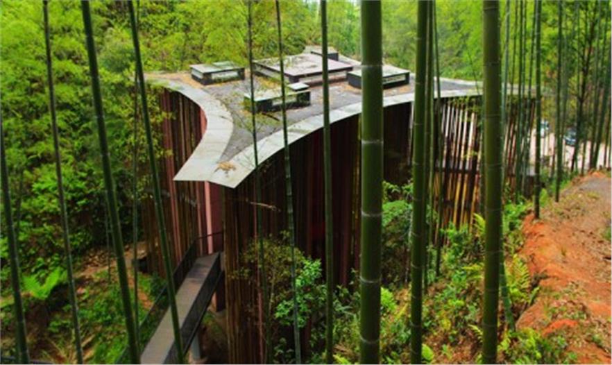 在建筑下部刻意形成一池水面,并巧用清晨、黃昏、雨天、冬日等時間段水面上下的溫差,達(dá)成云霧繚繞的現(xiàn)象;當(dāng)云霧彌漫與光色交相輝映之際,建筑與周邊的自然之竹詩性地融合成一體……;總之,該建筑系充分理解竹??臻g特征并有效地操控自然氣候因子的結(jié)果。