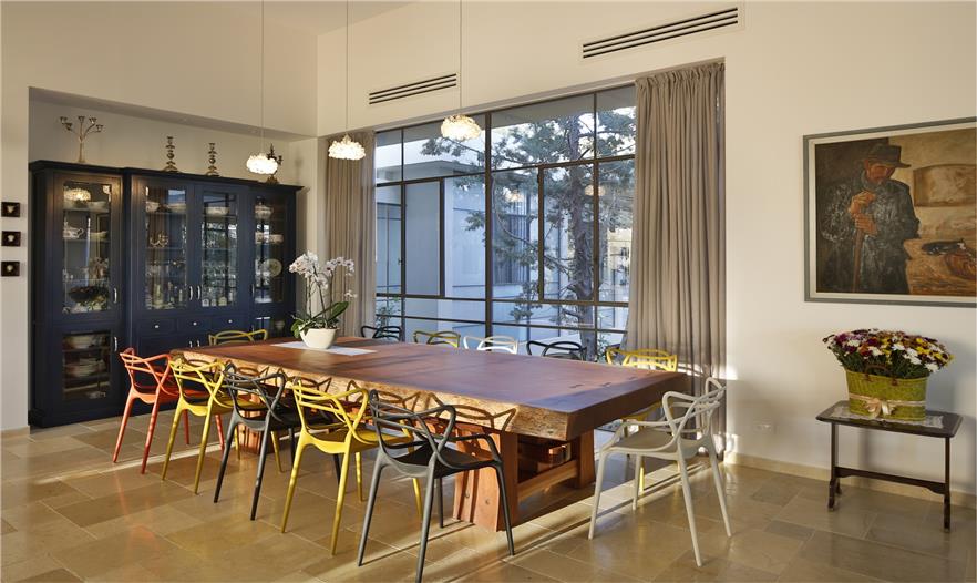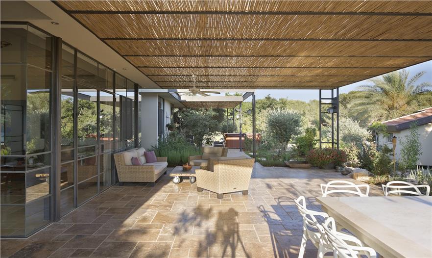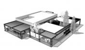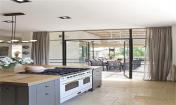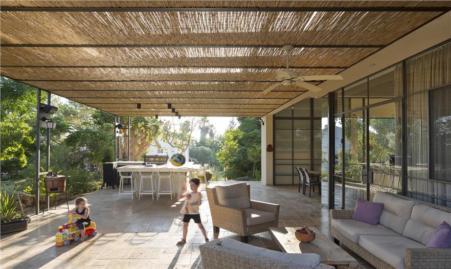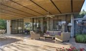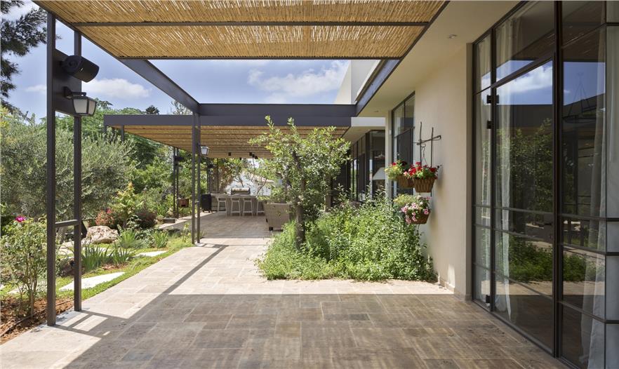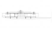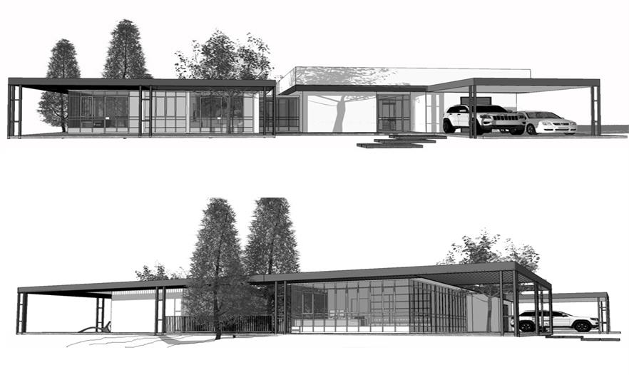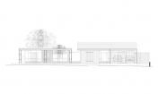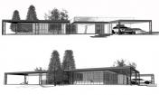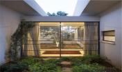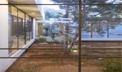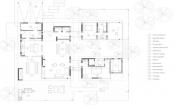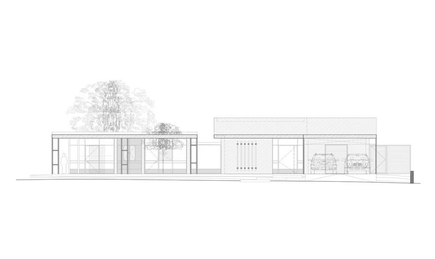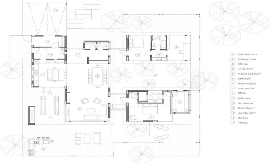 經(jīng)過深入詳細(xì)的規(guī)劃,廣場的剛架被打斷,房子被分成三個部分:其中中央部分通過兩個“連接器”連到兩個次要部分,連接器是狹窄的透明通道。庭院在三個廂房之中,施工前保持自然狀態(tài),第四個區(qū)域有一座橋,這實際上界定了內(nèi)部露天空間,而橋下是花園。房子主要以開口為特點,除了西側(cè),房屋的其他面均從地板延伸到天花板,房屋西側(cè)被遮蔽,模糊了室內(nèi)外之間的過渡,在主要開口上創(chuàng)造連續(xù)不斷的陰影。中央分區(qū):空間高約4米,包括餐廳、廚房和儲藏室。這個空間還用于布置餐桌、座位區(qū)和戶外廚房。