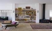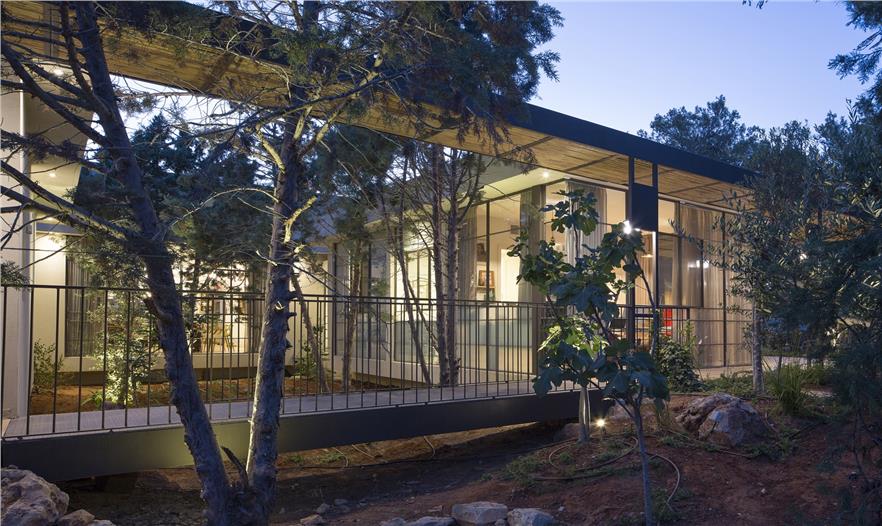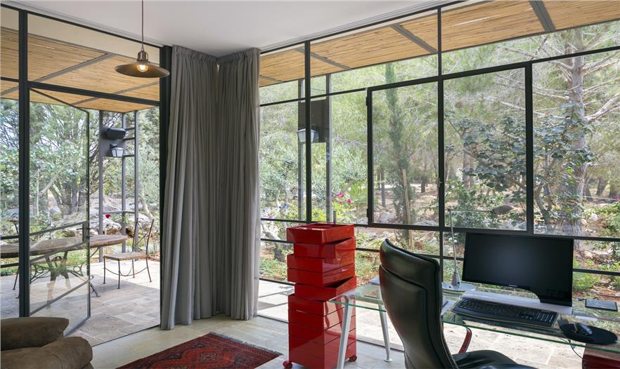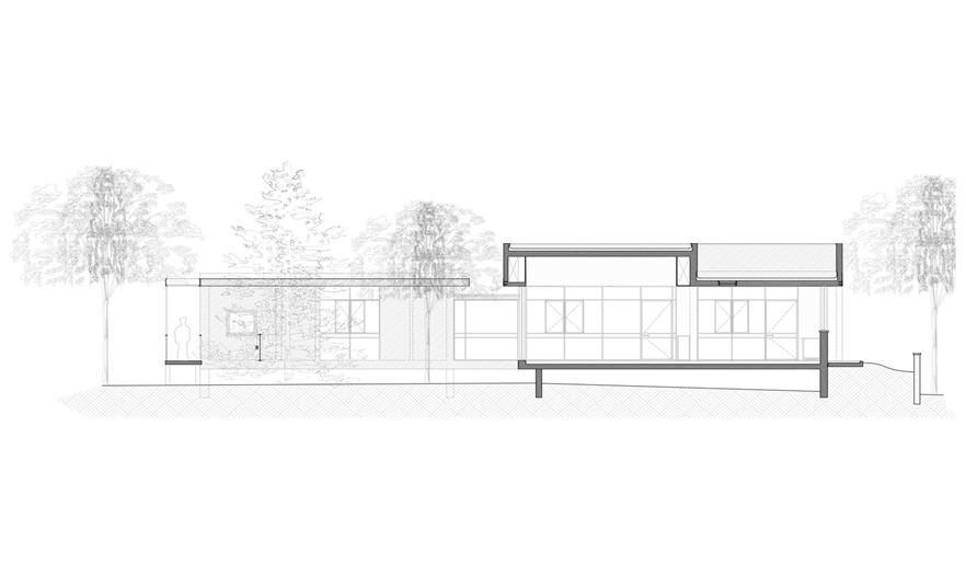 北廂房朝向街道,包括客房、浴室、廚房和書房/辦公室。室外玻璃墻顯示這種分區(qū)。書房位于東端,三面敞向自然森林。次要空間天花板的高度是3米。