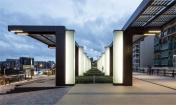 以預(yù)制混凝土打造而成的梁柱斜向交接,支撐起整座建筑物,規(guī)律而又充滿動(dòng)感的結(jié)構(gòu)讓人回想起舊日的鐵路橋梁。通透卻封閉的玻璃立面在隔絕噪音的同時(shí),讓穿梭而過(guò)的列車成為了城市中一道獨(dú)特的風(fēng)景線。建筑結(jié)構(gòu)屋頂與城市街道相比較高4-12余米不等,成為俯瞰相鄰街區(qū)的最佳場(chǎng)所。東西向延伸的兩條小路串聯(lián)起功能、形態(tài)各不相同的一個(gè)個(gè)小花園,也帶來(lái)各異的空間體驗(yàn):北側(cè)小路籠罩在樹(shù)蔭之下,陰涼安靜,而南側(cè)的道路則常年沐浴在陽(yáng)光下,溫暖明亮。在兩條道路之間,高低起伏的綠地中樹(shù)木繁茂地生長(zhǎng)著,精心設(shè)計(jì)的灌木與草本植被群落將隨著季節(jié)更迭而變幻著色彩。而茂密的植被又進(jìn)一步強(qiáng)化了地勢(shì)的起伏之感,將身處其中的人們與喧囂的城市環(huán)境相隔絕,打造了一片城市中心的自然叢林。包括了5座電梯,2條坡道,3個(gè)樓梯與4條扶梯在內(nèi)的3個(gè)交通節(jié)點(diǎn)作為入口空間穿插其中,連接著公園與城市街道。更為開(kāi)闊的硬質(zhì)廣場(chǎng)空間打破了連續(xù)的綠地序列,形成了標(biāo)志性的入口空間。光伏板鑲嵌在巨大的涼亭頂棚上,投下陰涼,也為公園儲(chǔ)備了充足的光電能源。