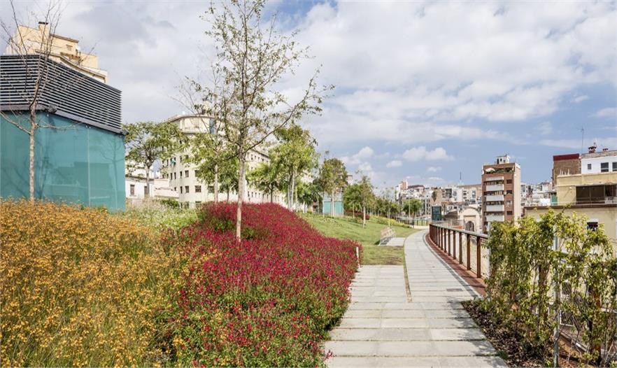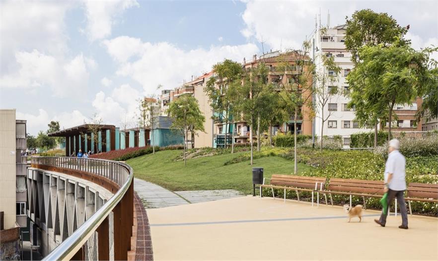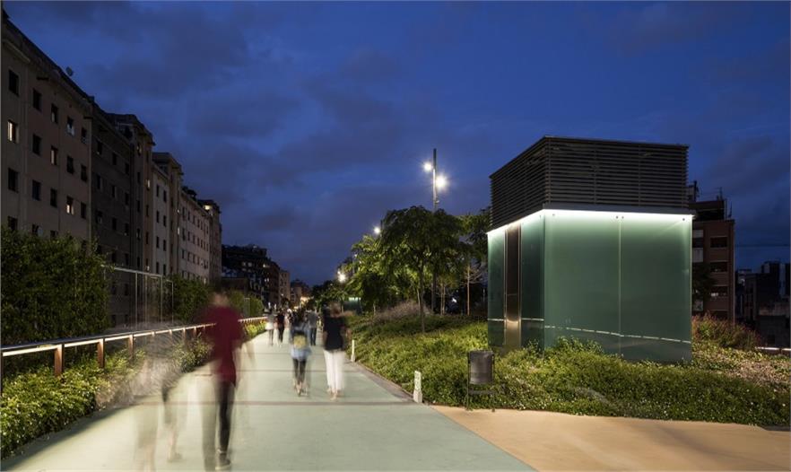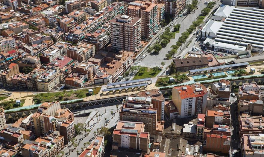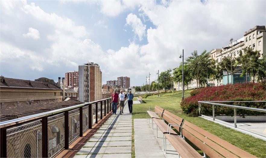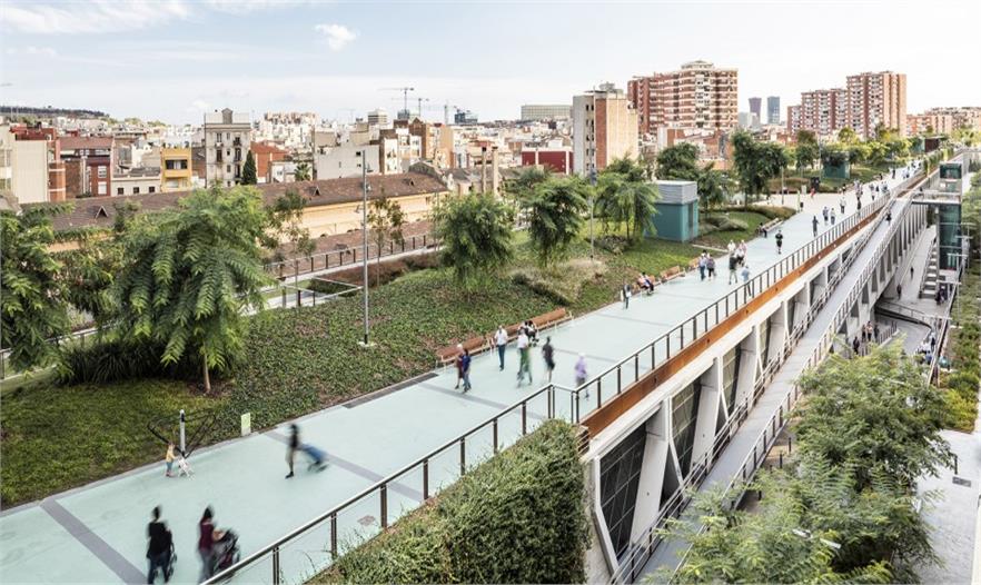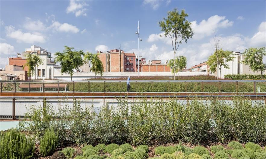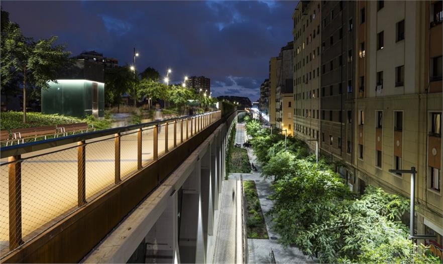 在巴塞羅那桑茲區(qū)中,建于上世紀(jì)的火車與地鐵軌道如同一道遺留在城市肌理中的巨大傷疤。占地30米寬的8條鐵軌并列而行,延綿800余米,將城市一分為二,不僅破壞了城市本應(yīng)流暢的功能轉(zhuǎn)接,同時(shí)也帶來(lái)了巨大的噪音,進(jìn)一步降低了城市空間的質(zhì)量。2002年,城市管理局決定聯(lián)合區(qū)域內(nèi)的三個(gè)形成機(jī)構(gòu)與社區(qū)委員會(huì),啟動(dòng)針對(duì)這片鐵路走廊區(qū)域的城市更新計(jì)劃。由于受限于技術(shù)與經(jīng)濟(jì)條件,業(yè)主方最終摒棄了將整套交通系統(tǒng)下埋于地底的方案,而決定將一個(gè)通透的“盒子”籠罩在鐵軌上方,最終打造出一個(gè)800米長(zhǎng)的空中花園。在未來(lái),這條綠帶會(huì)繼續(xù)向著周邊的Hospitalet、Esplugues與Cornella區(qū)域延伸,最終形成一條總長(zhǎng)5公里的綠色走廊。