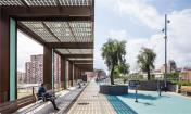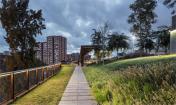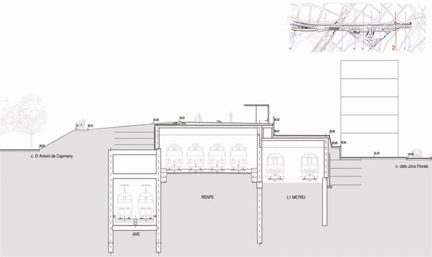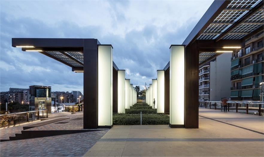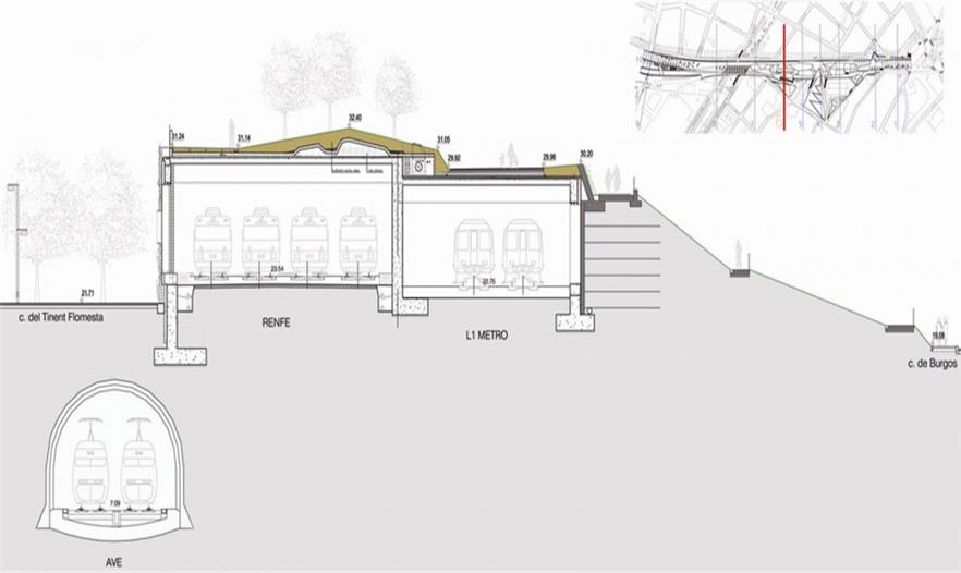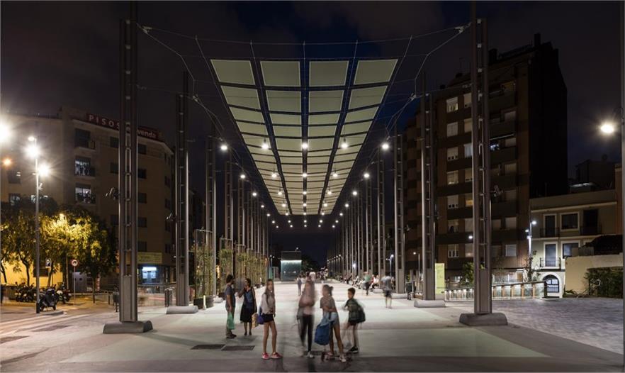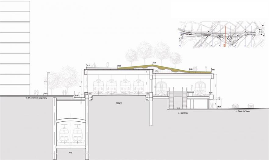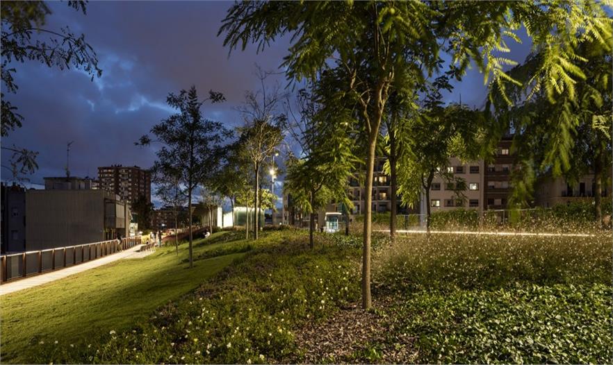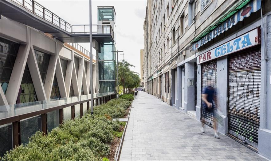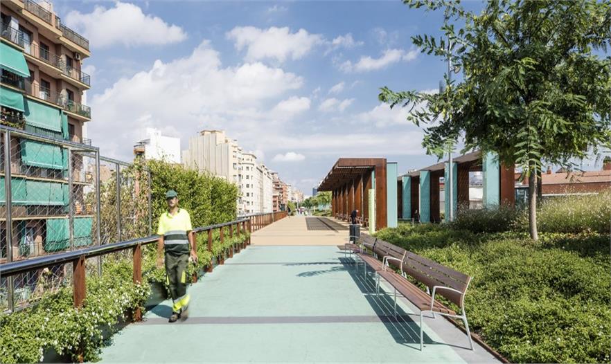 在巴塞羅那桑茲區(qū)中,建于上世紀(jì)的火車與地鐵軌道如同一道遺留在城市肌理中的巨大傷疤。占地30米寬的8條鐵軌并列而行,延綿800余米,將城市一分為二,不僅破壞了城市本應(yīng)流暢的功能轉(zhuǎn)接,同時(shí)也帶來(lái)了巨大的噪音,進(jìn)一步降低了城市空間的質(zhì)量。2002年,城市管理局決定聯(lián)合區(qū)域內(nèi)的三個(gè)形成機(jī)構(gòu)與社區(qū)委員會(huì),啟動(dòng)針對(duì)這片鐵路走廊區(qū)域的城市更新計(jì)劃。由于受限于技術(shù)與經(jīng)濟(jì)條件,業(yè)主方最終摒棄了將整套交通系統(tǒng)下埋于地底的方案,而決定將一個(gè)通透的“盒子”籠罩在鐵軌上方,最終打造出一個(gè)800米長(zhǎng)的空中花園。在未來(lái),這條綠帶會(huì)繼續(xù)向著周邊的Hospitalet、Esplugues與Cornella區(qū)域延伸,最終形成一條總長(zhǎng)5公里的綠色走廊。