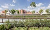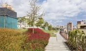 點(diǎn)綴在公園中的黃檀木、槐樹(shù)、沙果樹(shù)將在春夏盛開(kāi)或黃或白的花朵。而綠色的草坪、鱗芹、紅色鼠尾草、野玫瑰、常春藤、長(zhǎng)春花、白色馬纓丹等下層灌木草本交織種植,順著北側(cè)的小路蔓延,深綠色的背景中點(diǎn)綴著朵朵白花。而沿著建筑立面,常春藤、素馨葉白英、三尖栝樓等攀緣植物順著立面上的金屬網(wǎng)架系統(tǒng)向上蔓延生長(zhǎng),讓綠意覆蓋建筑立面的每一個(gè)角落。