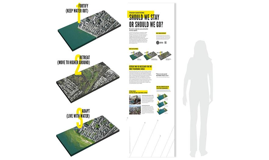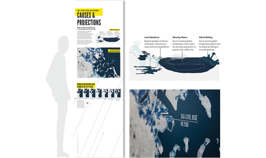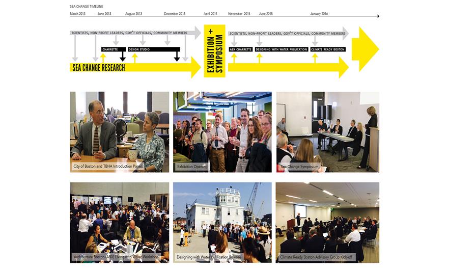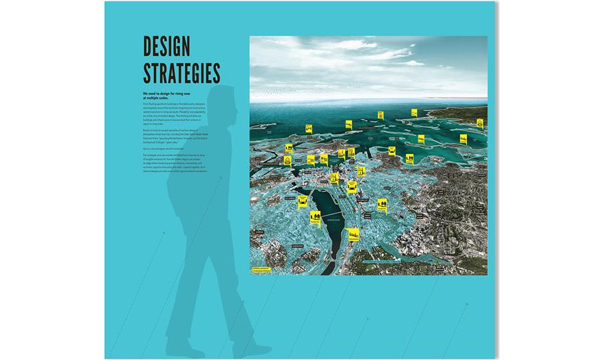 波士頓海平面變化研究是一項關于海平面上升的研究倡議活動,提倡大波士頓區(qū)的海岸彈性長期發(fā)展規(guī)劃。海平面變化研究團隊由景觀設計師領導,與科學專家、學術專家、擁護者和決策者合作參與建筑、城市和區(qū)域尺度的準備工作。設計師以展覽的方式展示這個研究,突出波士頓的弱點,證明彈性設計策略的必要性。該展覽與大波士頓社區(qū)共享海平面研究,形式生動、易理解,圖表豐富,還有互動性媒體。與展覽相關的活動和電子媒體促進了設計師、市政官員、房地產(chǎn)商和學術專家之間的對話,將理論付諸于行動:讓大波士頓區(qū)實施彈性發(fā)展方案。海平面變化的成果包括合著與水設計(Designing with Water)論文,為波士頓與水設計競賽(Boston Living with Water Competition)提供參考,實施Climate Ready Boston方案(波士頓氣候變化弱點評估)。