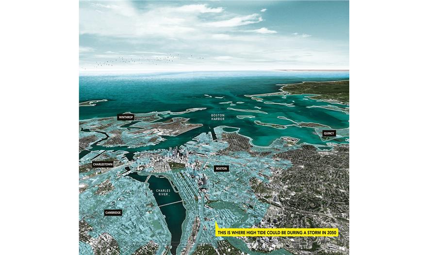 據(jù)預測,到中世紀海平面會上升0.6米(2英尺),2100年上升1.8米(6英尺)。這個新潮汐線將改造海港城市景觀,增加暴雨摧毀都市的危害。在波士頓有驚無險地躲過颶風桑迪之后,該城市開始調(diào)查建造一個彈性海港城市意味著什么。但是,直到最近發(fā)現(xiàn)波士頓的這個對話沒有設計師的加入——他們的意見很關鍵,決定著此背景下可實施性的有效方案能否讓波士頓改造成彈性城市,同時確定和加強該城市獨特的區(qū)域感。設計師為大波士頓區(qū)提倡長期的彈性策略,建立了關于海平面上升的研究倡議,名為波士頓海平面變化研究(Sea Change: Boston)。