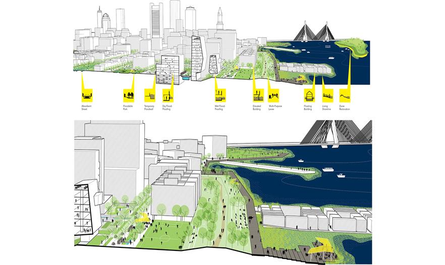 除了記錄海平面的危害外,海平面變化研究與建筑、城市和區(qū)域規(guī)模的前瞻性設計和規(guī)劃策略為特色。從漂浮的公寓建筑到可浸的公園,全球的設計師和工程師正在構(gòu)思和構(gòu)造應對海平面上升的彈性方案。研究探索彈性設計策略如何能夠讓波士頓的建筑和基礎設施從暴雨危害中恢復過來,適應上升的潮汐。這些策略和案例研究分門別類,闡釋一系列波士頓區(qū)域如何保護其邊緣同時加入濱水的活力、連接性和經(jīng)濟機會。