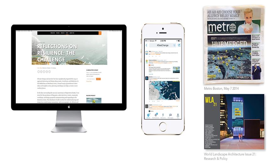 除了實體展覽外,海平面變化研究會以數(shù)字主體方式存在?;有缘牡貓D邀請參展者和網(wǎng)頁用戶探索海平面上升問題和風暴潮情景,與此同時覆蓋脆弱的城市系統(tǒng)分析。波士頓市使用線上地圖用于他們的Greenovate活動,更新2014版本,適應氣候行動方案。二維碼也在展覽當中,將游客與Greenovate活動連接起來。線上“社區(qū)參與”視頻采訪波士頓當?shù)鼐用窈推髽I(yè)主,闡釋他們對海平面上升的憂慮和警覺。“彈性發(fā)展響應”博客系列有大量實踐家分享規(guī)劃和設計如何建造更加彈性未來的理念和見解。多種社交媒體活動——#SummerofSLR、#SemesterofSLR和 #SeaChange——也成為海平面變化研究的電子平臺。
