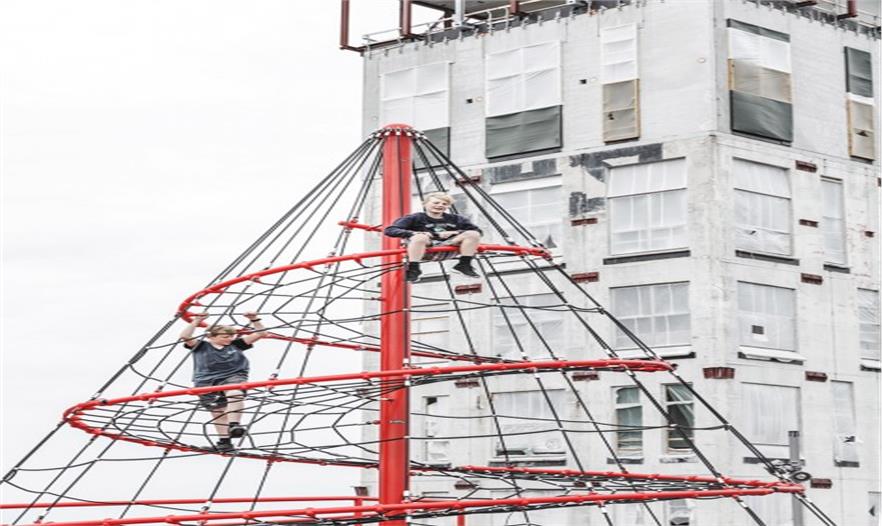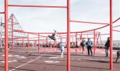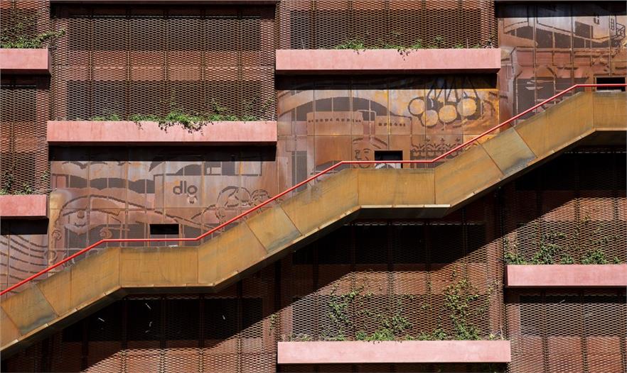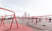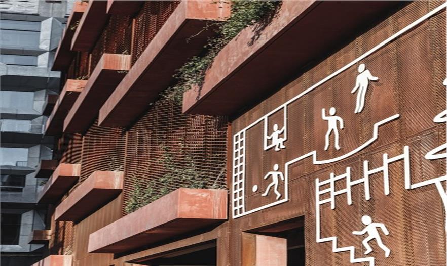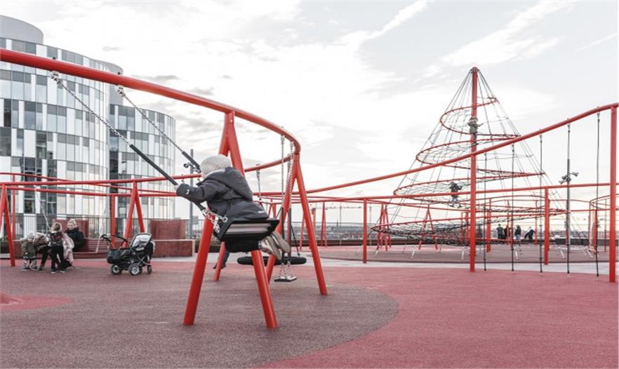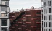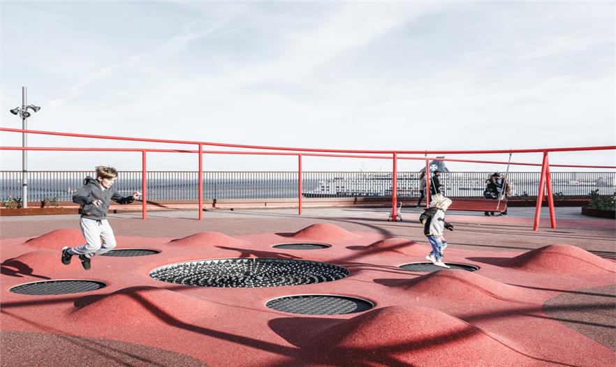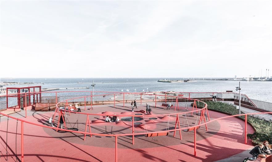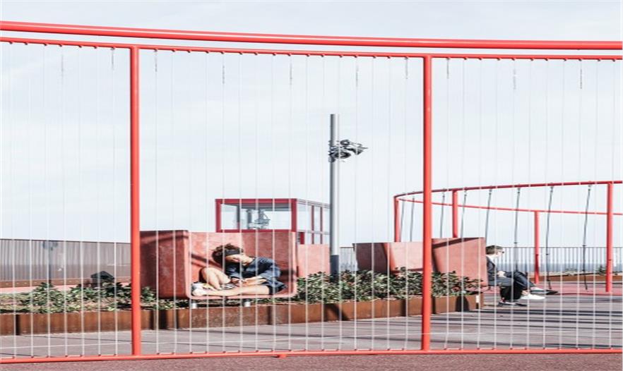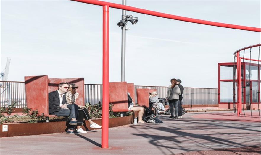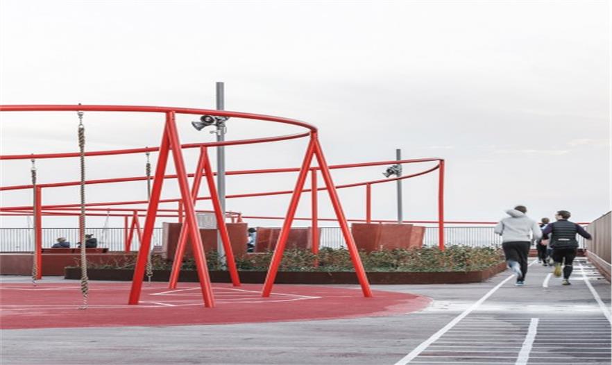 設(shè)計并沒有試圖隱藏停車建筑的結(jié)構(gòu),而是希望以暴露的結(jié)構(gòu)打破建筑立面的尺度,將其美麗展示在人們面前。一系列的種植槽外掛于立面之外,形成了與結(jié)構(gòu)相呼應(yīng)的節(jié)奏韻律,在創(chuàng)造宜人空間尺度的同時,將綠色帶到了每一個角落。兩條巨型樓梯穿插其中,其上的鋼制扶手延綿而上,在屋頂轉(zhuǎn)化為秋千、攀爬架、單杠等等面向各個年齡階層的運(yùn)動游樂設(shè)施,創(chuàng)造出一個活力十足的公共空間。從街道上看去,這道色彩亮麗的扶手仿佛邀請著人們拾階而上,去盡享讓人驚艷的屋頂景觀、俯瞰壯觀的哥本哈根港口全景。
