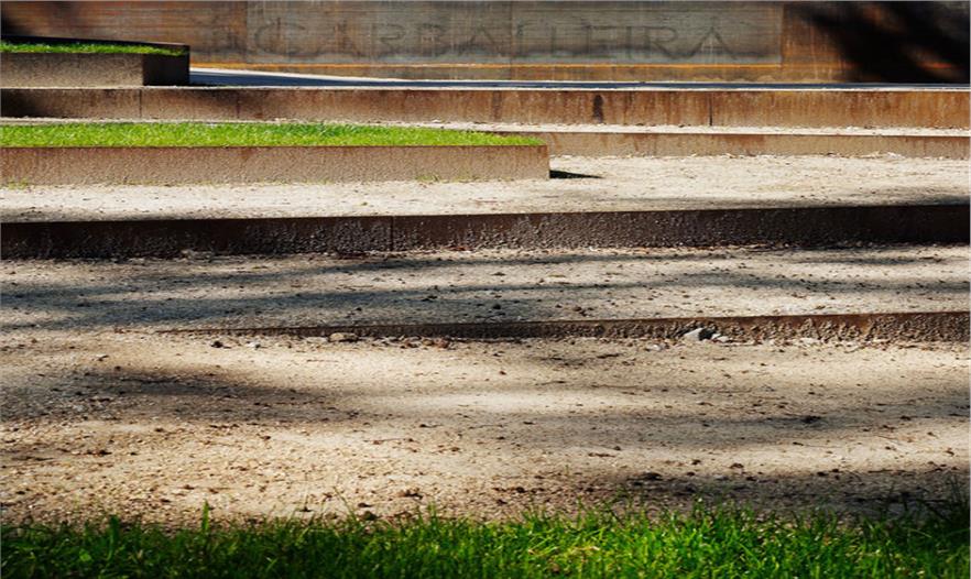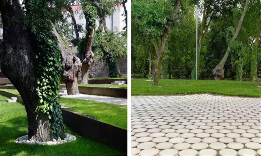 根據(jù)不同的結構和問題,改造被分成兩部分。一方面,即公園花園部分,改造的主旨在于將現(xiàn)有的一些元素進行整合,并尊重場地的歷史性。另一方面,對于橡樹森林,主要目標是在其區(qū)域內(nèi)建立步行活動網(wǎng)絡,將行人和車輛合理有序的集成在自然景觀中。為了實現(xiàn)這一目標,研究了橡樹輪廓線之間的幾種路徑,由于要勾連幾個廣場和空間,因而路線的設計有一系列的梯田輪廓線,可以作為觀賞表演的座椅,或者是單純的休息座椅。臺階和長椅也多采用預制混凝土工藝。