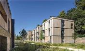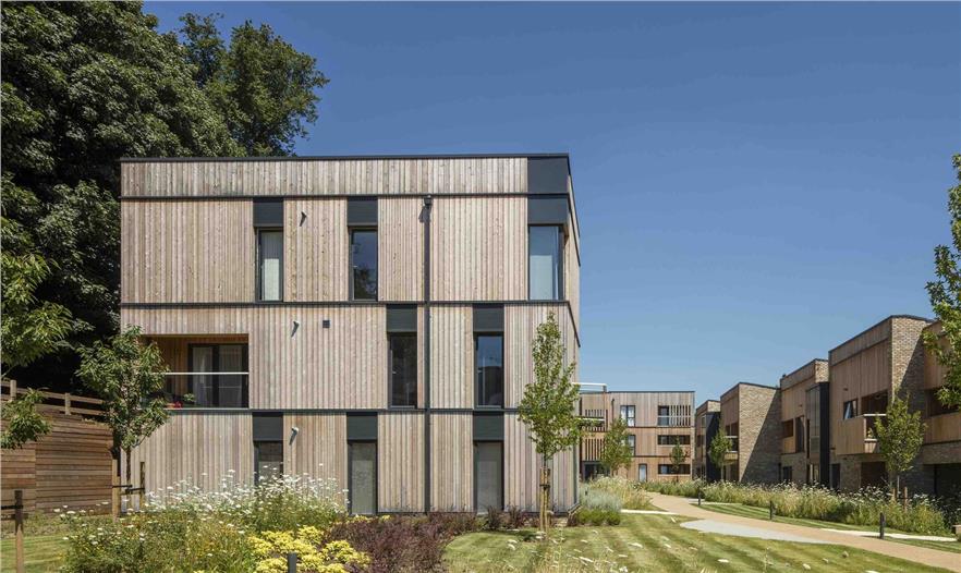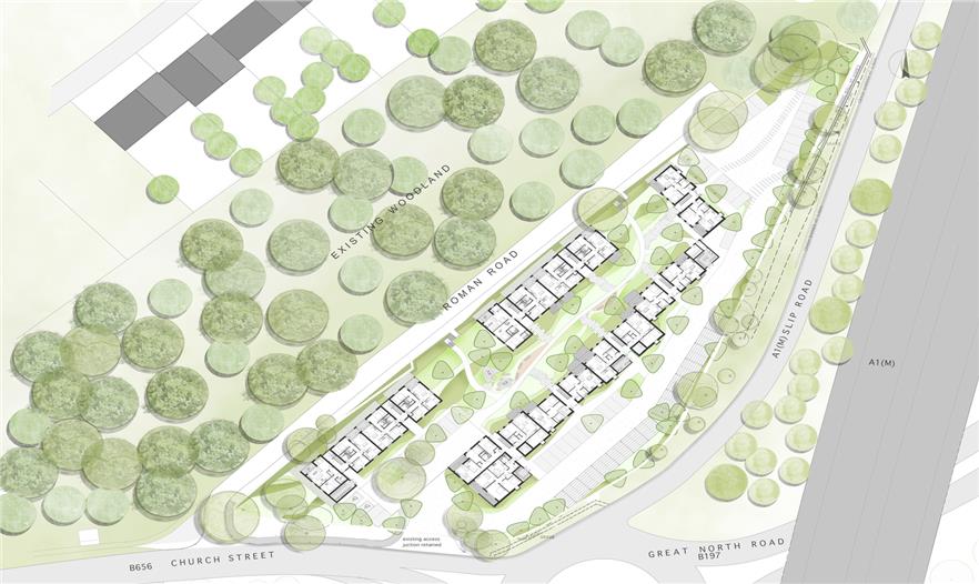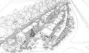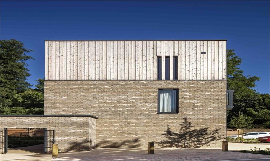 花園位于韋林市的關(guān)鍵入口處,它把一塊廢棄的酒店改建成了擁有50戶新家庭的私人社區(qū)。設(shè)計(jì)呼應(yīng)了周圍8000平方米的場(chǎng)地,這里擁有獨(dú)特的城鄉(xiāng)結(jié)合環(huán)境,一側(cè)是A1(M)高速公路,另一側(cè)是茂密的林地。我們的設(shè)計(jì)理念是打造一處有圍墻的村寨,建筑要讓道路側(cè)的噪音和污染盡可能減少,同時(shí)還要從所在位置的幾何形和周邊的林地上最大化地受益。五棟二至三層的磚砌小樓外掛木板,幾棟樓共同創(chuàng)建出了共享的中央庭院。