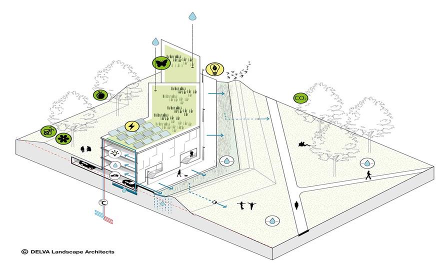 在糖公園區(qū)生活就意味著可持續(xù)性生活方式。在城市設(shè)計中采用再利用、智能設(shè)計和技術(shù),強調(diào)可持續(xù)性生活方式。由于幾大不同原因,該區(qū)域適合可持續(xù)性、有機發(fā)展。這個方案很具靈活性,尋找水、材料、能源和食物使用的平衡以及如何滿足未來居民和周邊城市需求的答案。這個理念對該項目第一個階段的倡議是具有靈活性的。綠色屋頂確保少量的熱損耗。另外,綠色屋頂幫助緩沖和放緩雨水排放。水也能儲存到住宅中,再次進行使用。