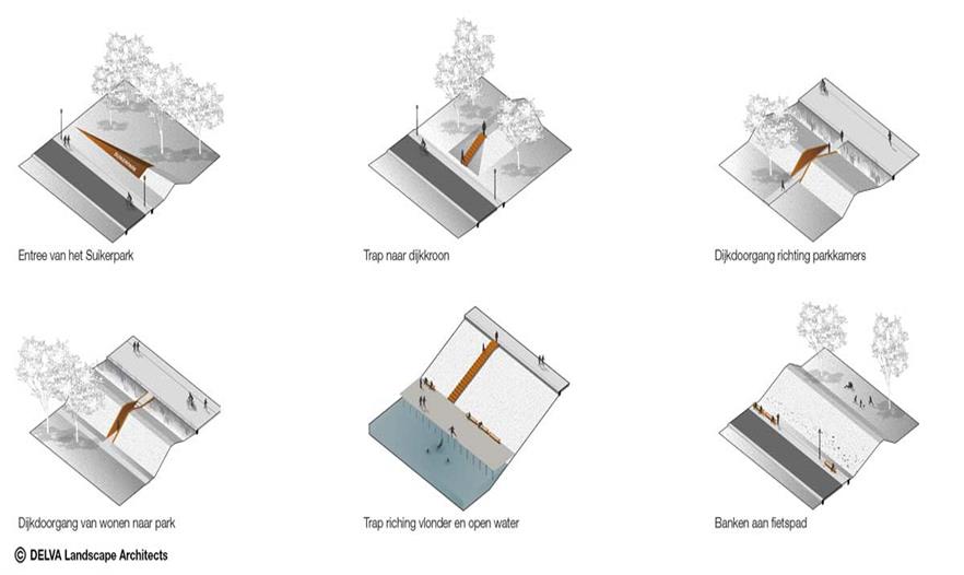 這4種氛圍營造出空間復(fù)雜性和一個多層公共空間,讓該區(qū)域更加吸引人,主要體現(xiàn)在堤壩、糖公園、庭院和糖廣場中。