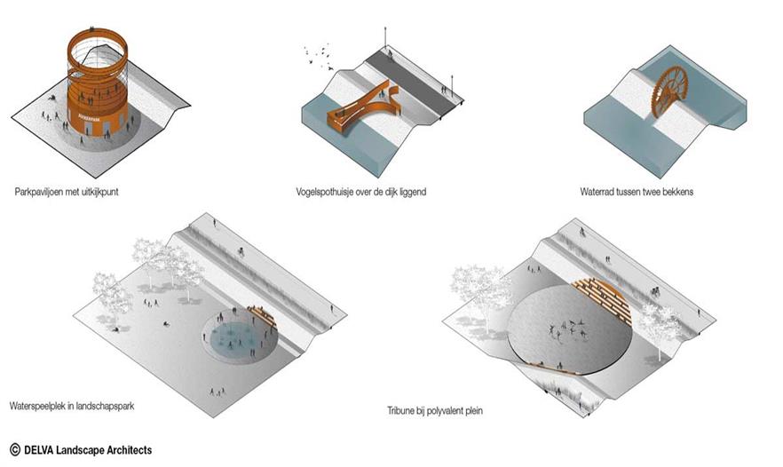水是該區(qū)域的顯著特征。雨水不應(yīng)該成為排水的負擔(dān),應(yīng)對減少地下水位產(chǎn)生積極的影響。在主要的降雨期間將水收集到滲透區(qū)。這個區(qū)域構(gòu)成了該公園和住宅之間的邊緣。當(dāng)有過多的雨水時,這些滲透區(qū)會成為一個開放的水渠,引導(dǎo)雨水進入排水管中。人們運作水車,將一邊水池的水抽到另一個水池中,然后進入到Lovaart。