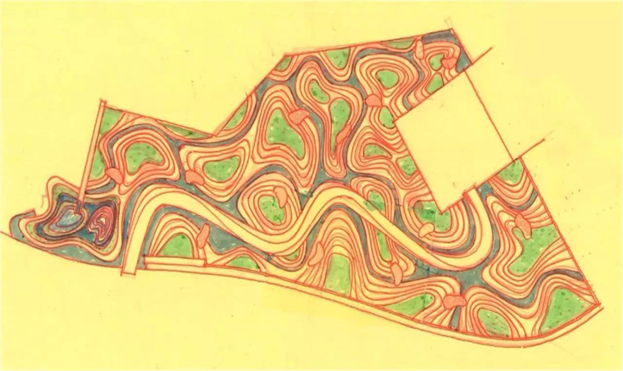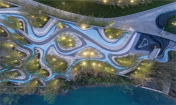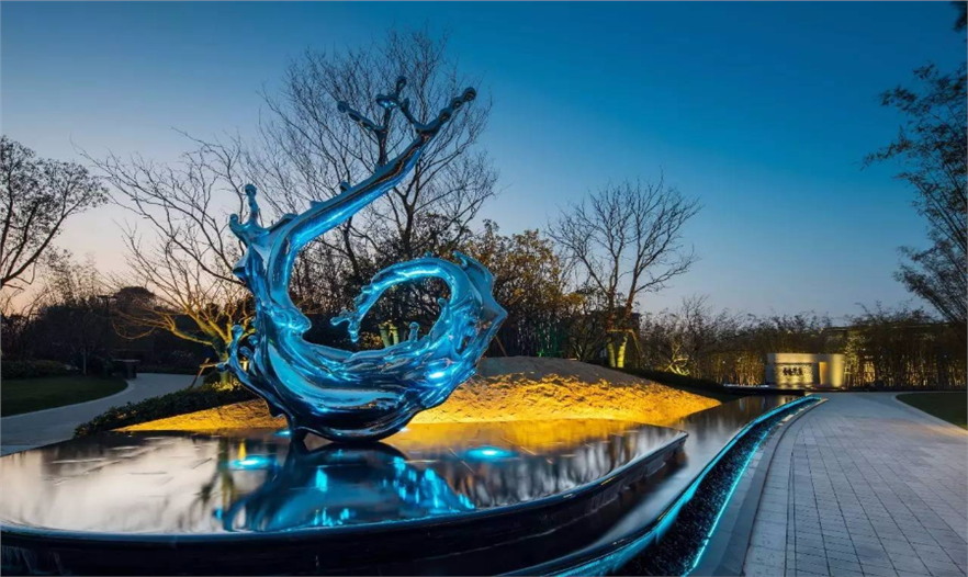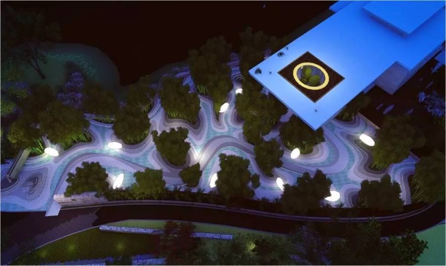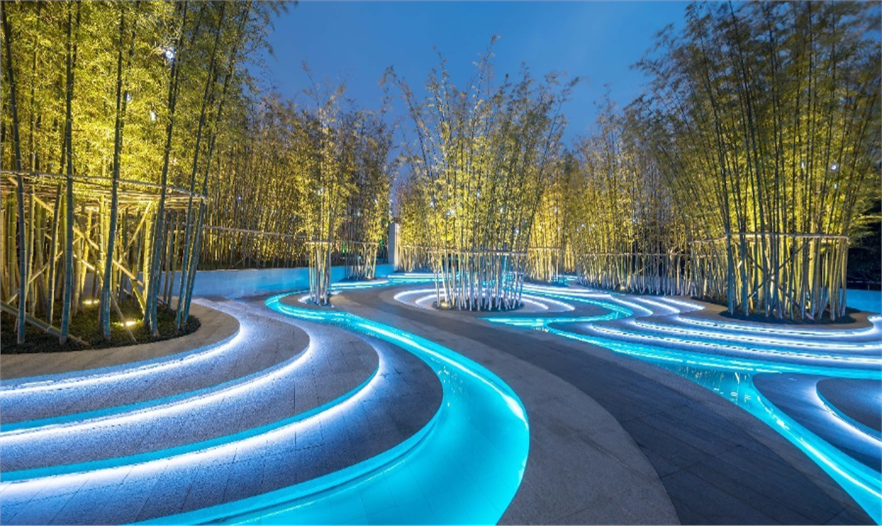 模擬自然山水的肌理,采用大地藝術(shù)的構(gòu)圖,描繪科技、流動(dòng)的藍(lán)色光帶,雕刻藝術(shù)游龍。