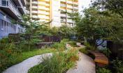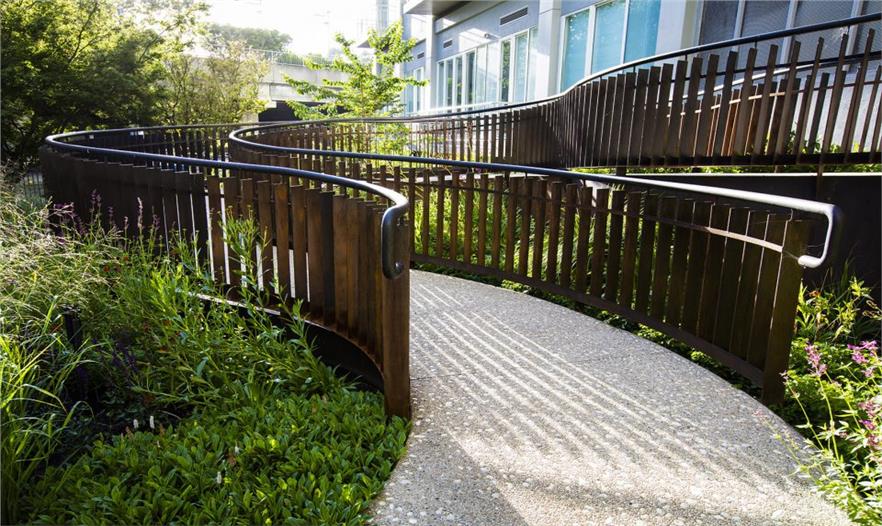 花園種植多種植物,同時(shí)設(shè)有木質(zhì)長椅,混凝土矮墻,與居住公寓相連的混凝土步行道和樓梯,鋼結(jié)構(gòu)圍擋,及無障礙坡道。大量的多年生植物環(huán)繞花園主體空間種植,創(chuàng)造了輕松平靜的氛圍。花園位于地下停車場之上,有限的場地條件迫使設(shè)計(jì)師仔細(xì)斟酌綠植的選用。除此之外,設(shè)計(jì)師還需考慮在花園與街道之間設(shè)置綠林以保證花園的私密性。