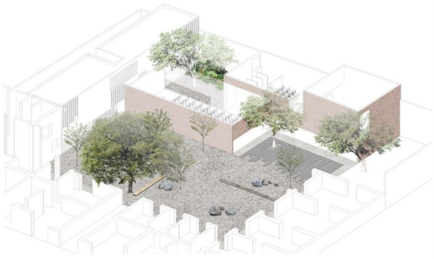 設(shè)計賦予土地以肌理,并模仿原有元素。建造時所留下的灰色礫石被重新利用起來,作為對于建造過程的紀(jì)念。礫石小道從外面延伸至院子里,吸引著使用者前來休憩?;厥盏牡首雍透駯懦蔀榱司坝^節(jié)點的一部分,成為了過去記憶的與現(xiàn)在的廣場中的日常生活之間的聯(lián)系。