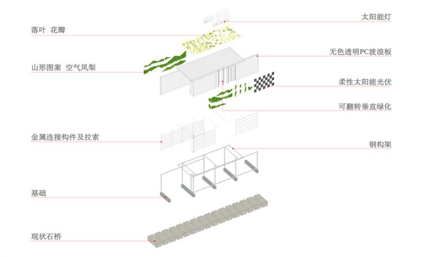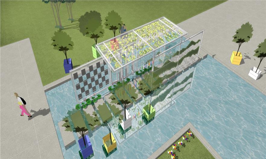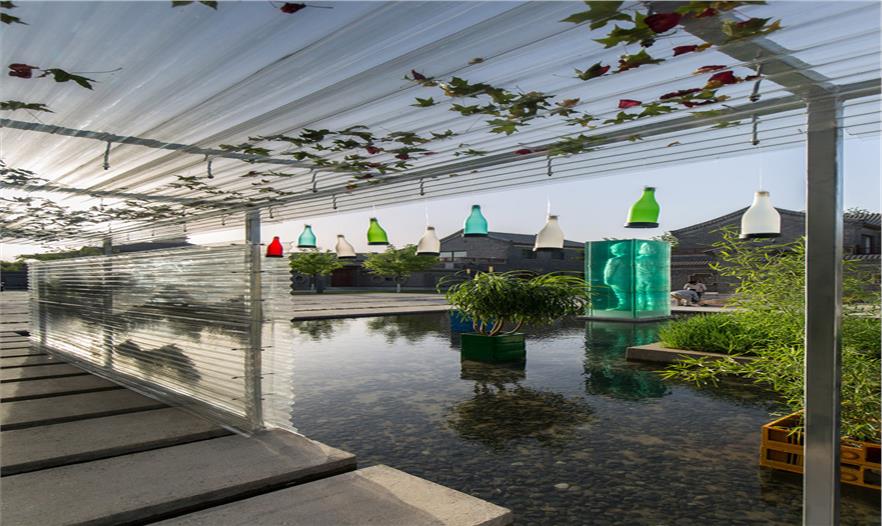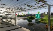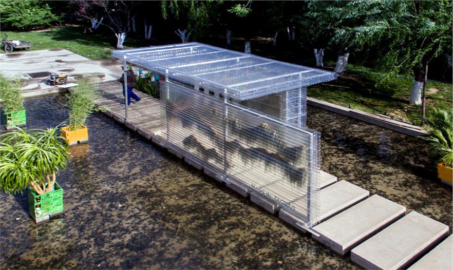 場地水池中的高大楊樹和水池周邊的柳樹、海棠,形成了良好的喬木碳匯基礎(chǔ)。我們在透明的PC波形板中懸掛了四百多株松蘿,作為空氣鳳梨的一種,它能在空氣中生長。在水中的種植箱中,散尾葵、翠竹等植物似乎漂浮在水面上。喬木、灌木、懸掛草本與睡蓮等水生植物共同形成了一個植物生態(tài)系統(tǒng)。