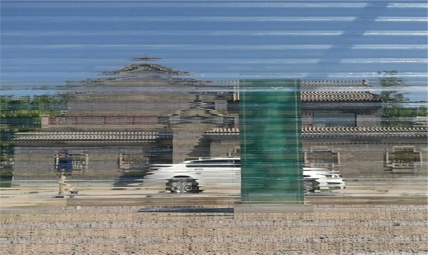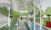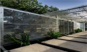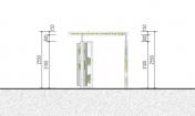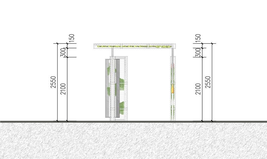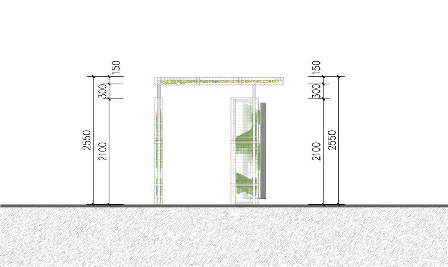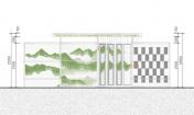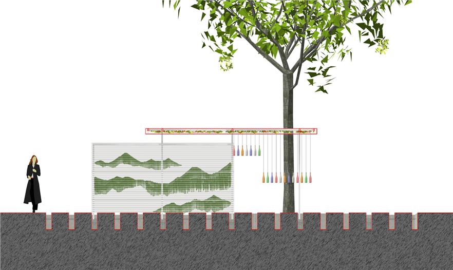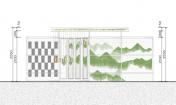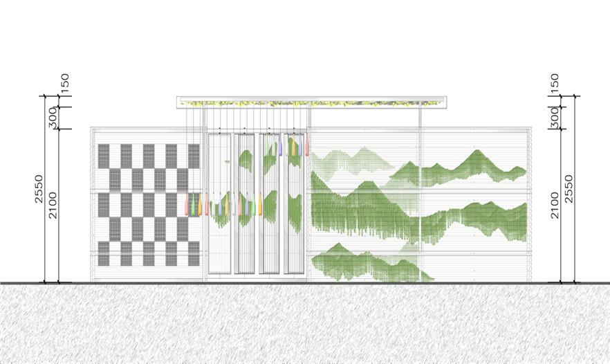 空氣鳳梨在雙層PC板中,拼成了唐伯虎的山水畫“金昌送別圖”,多層透明形成了濃淡漸變的層次,頗有傳統(tǒng)山水的意境。山水圖在翻轉(zhuǎn)門中形成圖案的動態(tài)變化,并探討了可翻轉(zhuǎn)垂直綠化作為遮陽的可能性。