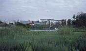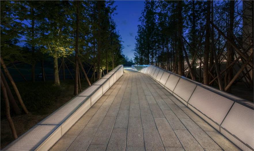 折橋是原有的水上結(jié)構(gòu),設(shè)計(jì)難點(diǎn)在于如何在荷載的約束下塑造出水上構(gòu)筑物的靈動特質(zhì),設(shè)計(jì)團(tuán)隊(duì)選擇用覆膜白玻璃和沖孔板結(jié)合的輕質(zhì)表皮結(jié)構(gòu)替代絕大部分的橋面扶手欄桿,維護(hù)欄桿演變的鋼龍骨體系為塑形提供了一定的結(jié)構(gòu)靈活度,與環(huán)境明暗調(diào)有高度反差的表皮又進(jìn)一步強(qiáng)化了結(jié)構(gòu)的輕盈質(zhì)感。