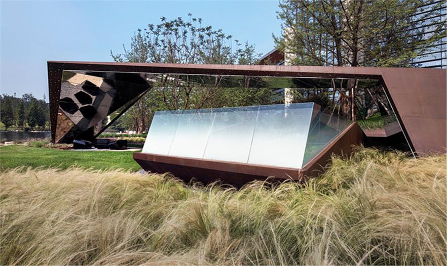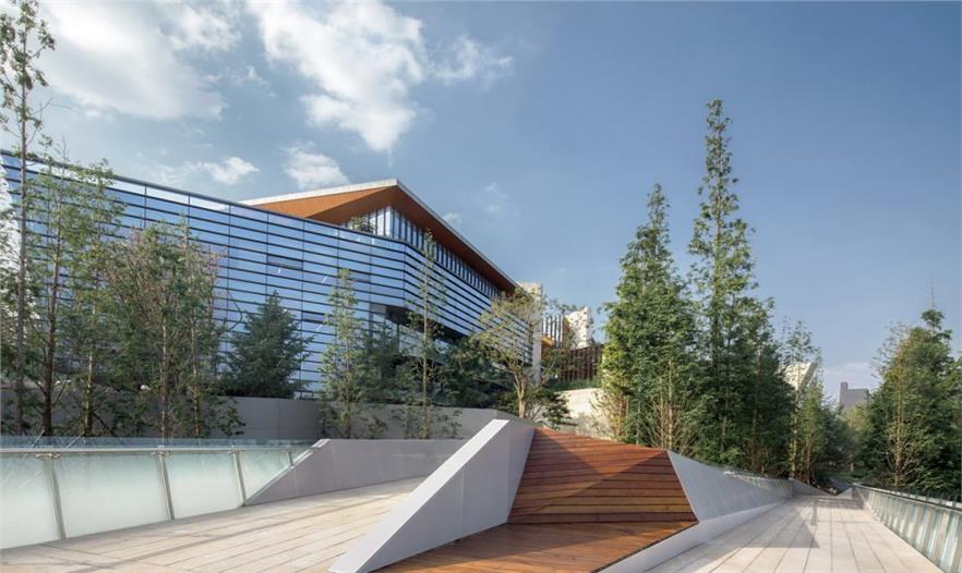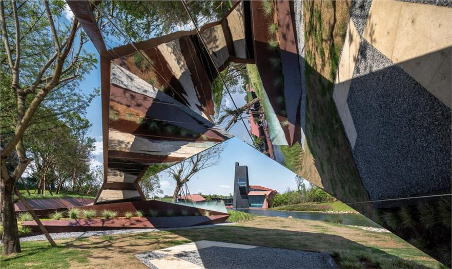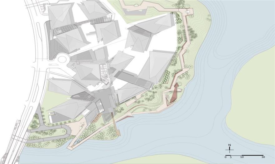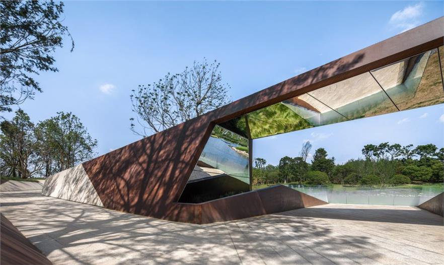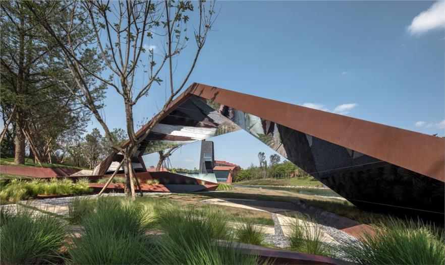 郎酒總部建筑設(shè)計(jì)風(fēng)格非?,F(xiàn)代,其臨湖一側(cè)是連續(xù)的自由立面,場地豎向的最大落差超過10米,進(jìn)深最窄的位置不過20米,相對較窄的陸域腹地尺度、挺拔的建筑體量與開闊的湖面尺度形成鮮明的對比,將對行人產(chǎn)生較為強(qiáng)烈的空間壓迫感。設(shè)計(jì)團(tuán)隊(duì)希望能通過景觀設(shè)計(jì)緩和轉(zhuǎn)化這種感受,平衡二者間的沖突感。通過提煉西南山地聚落豐富的步行體驗(yàn)元素,設(shè)計(jì)團(tuán)隊(duì)選擇積極對話建筑,呈現(xiàn)一系列轉(zhuǎn)折形態(tài)的路徑和界面,也因此確定了“折線公園”的名稱。