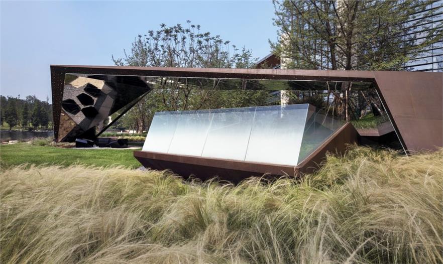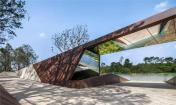 濱水建筑對一線湖景資源的訴求以及狹窄的陸域進(jìn)深,導(dǎo)致很難利用植物層次來造景,因此設(shè)計(jì)團(tuán)隊(duì)決定延續(xù)建筑漂浮屋頂?shù)脑O(shè)計(jì)理念,再置入一個與建筑屋頂相呼應(yīng)的景觀構(gòu)筑物——折廊。折廊有兩個維度的設(shè)計(jì)邏輯,其一是它必須具備一定的體量,才能在置入后起到協(xié)調(diào)建筑環(huán)境空間尺度的目的;其二是從近人尺度看它,又不應(yīng)構(gòu)成對湖岸建筑之間的視線障礙。這兩個邏輯之間存在一定的矛盾性,因而設(shè)計(jì)團(tuán)隊(duì)最終選用鋼構(gòu)折廊的方式完成這個設(shè)計(jì),在提供更加靈活的大跨度空間的同時(shí),避免常規(guī)承重墻柱對濱水環(huán)境中視線的分隔和遮擋。