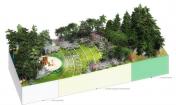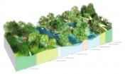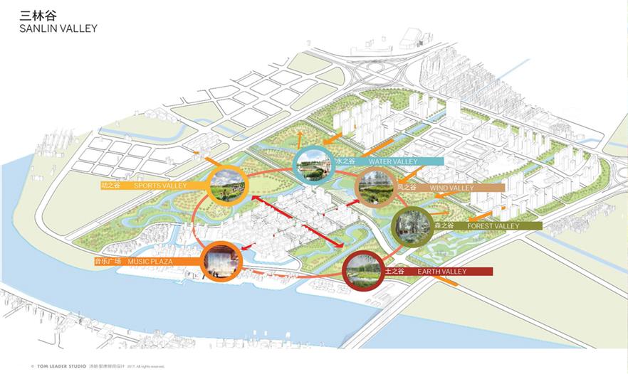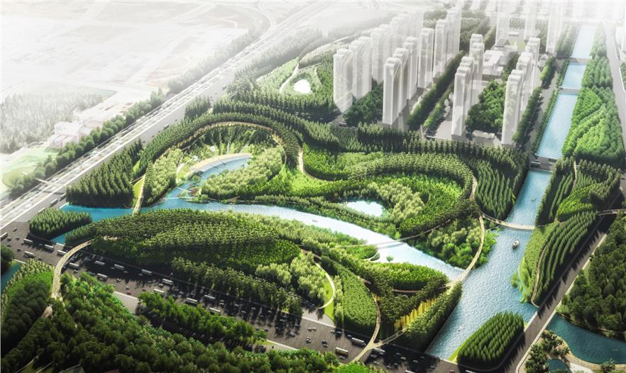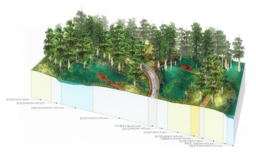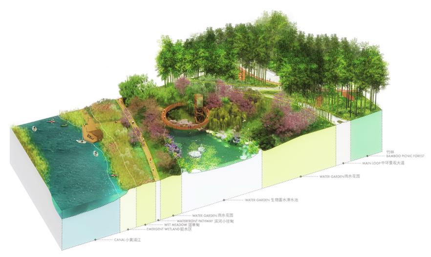 公園整體設計用不斷變化的微地形及“山谷”賦予場地活力,將回收再利用拆遷后的建筑廢料,并與地形建筑,地下車庫巧妙的結(jié)合,將公園地形有機的組織起來。地形結(jié)合橋體設計,通過“看不見的橋”跨越場地的道路水路分割,最終達到設計的整體性。這種富有變化的地形設計不僅將園橋連接起來,也有助于雨水的收集和再利用、微氣候及氣流的塑造及引導、豎向活動空間的豐富及設計,并最大程度優(yōu)化場地生態(tài)類別的多樣性,包括次挺水濕地,挺水濕地,雨水花園,濕草甸,低地森林與高地森林。公園大部分區(qū)域會被人工養(yǎng)植的本土植物所覆蓋,通過地形與水系的交織構(gòu)成一個系列的“山谷”,其中包括主題為“運動文化”的動之谷,生態(tài)學習互動的“水之谷”,風道設計核心的“風之谷”,杉林水溪的“森之谷”以及推廣可持續(xù)新型農(nóng)業(yè)及展示大地藝術的“土之谷”,除此之外濱江音樂廣場也將作為三林新地標融入在整個生態(tài)谷的設計當中。這些區(qū)塊的功能定位經(jīng)過一系列精密的場地設計及研究,將城市所需的活動與生態(tài)本底有機的交融在一起。