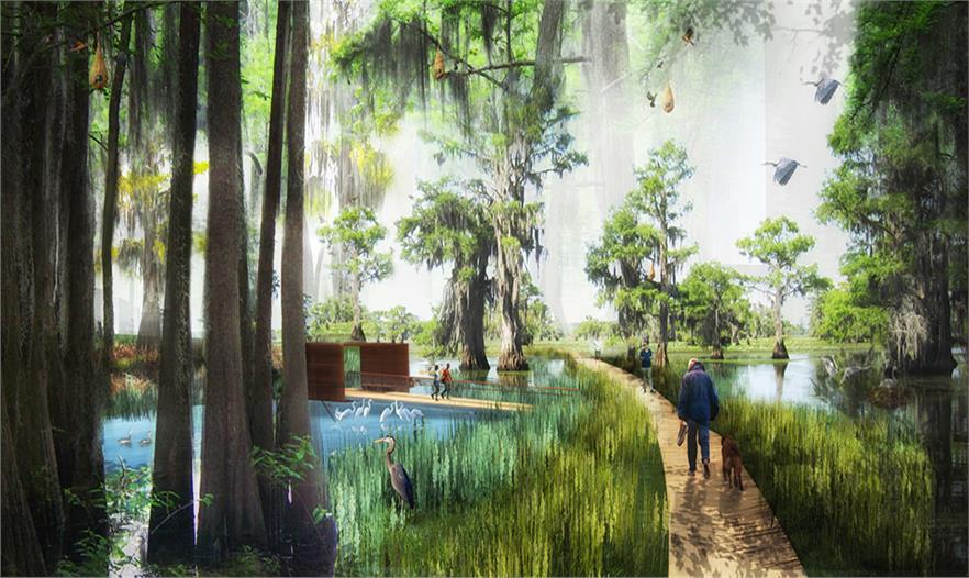 在總體的河道設計策略上,注重河道自身的凈水系統(tǒng)及季節(jié)性溪流的設計,打造四大凈水濕地并與不同區(qū)位生態(tài)特色相結(jié)合,如蘆葦蕩凈水濕地、氧合階梯凈水濕地、雨水花園挺水植物凈水濕地,以及水杉沼澤凈水濕地。為響應“海綿城市”的號召,場地也著力打造生物蓄水池及生物滯水區(qū)的設計,通過植草過濾渠收集到的雨水資源有效的利用,儲存和滲透引流,減輕場地及周邊地區(qū)的內(nèi)澇及雨洪問題。