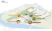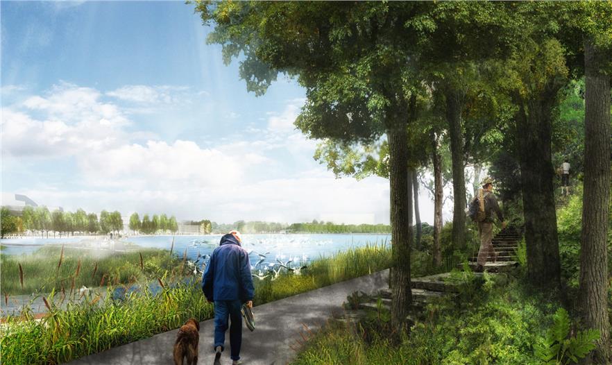 在交通上,公園通過三種不同類型的慢行系統(tǒng)有機的聯(lián)系起來,連續(xù)跨越的人行橋、景觀橋和生態(tài)橋使行人,自行車及動物擁有安全連貫的移動路徑。三大慢行系統(tǒng)由中心的內(nèi)環(huán)濱水大道、連綿起伏的中環(huán)景觀大道以及平坦靜謐的外環(huán)慢行大道著力構(gòu)成,更有兩條蜿蜒曲折的生態(tài)漫道與中環(huán)景觀大道交織而行。