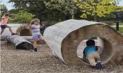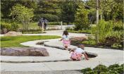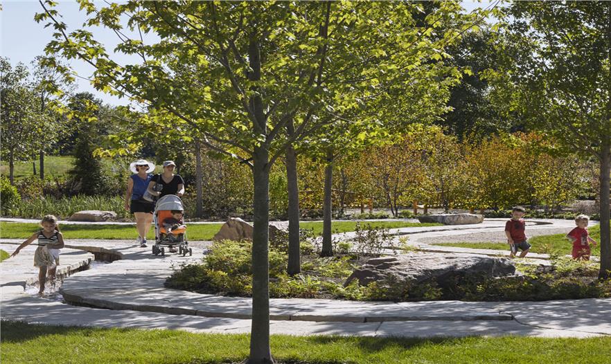 溪畔小路、石橋、火堆以及高處露臺(tái)的鋪裝設(shè)計(jì)都遵循可持續(xù)發(fā)展理念。小路采用來自中西部地區(qū)的鄉(xiāng)土或本地材料,成為夏季的清涼綠洲。小路中央的巨石噴泉讓所有兒童能夠接觸到水?;厥盏目招脑窘?jīng)過雕刻,成為兒童爬行、捉迷藏的地點(diǎn)。本地開采的巨石創(chuàng)造了更多探索的空間?;▓@西北角的雨花園在提供更多探索和學(xué)習(xí)機(jī)會(huì)的同時(shí),解決了重要的雨水管理問題。