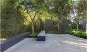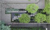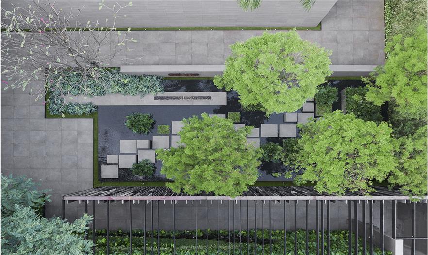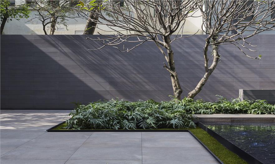 另一方面,花園設(shè)計了貼以瓷磚的長椅作為休息處,營造出舒緩放松的氛圍。鋪裝瓷磚具有自動清洗技術(shù),降低維護成本,避免開采天然石材。