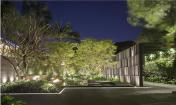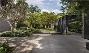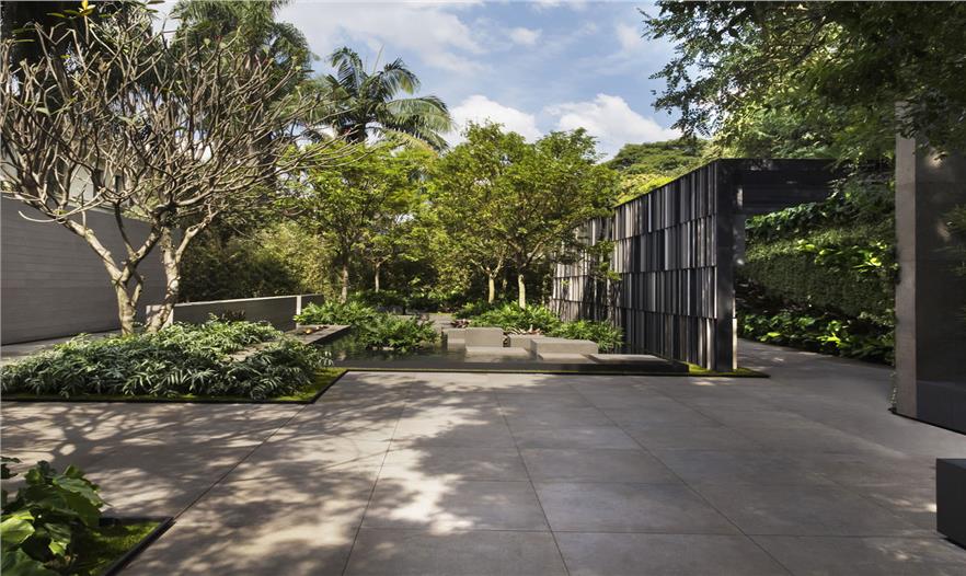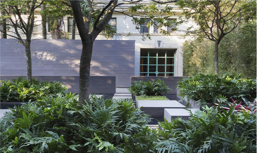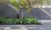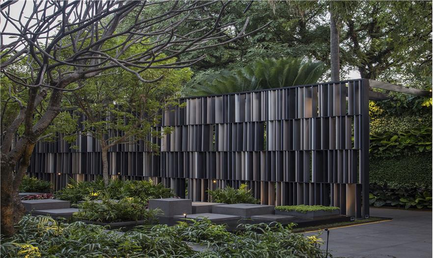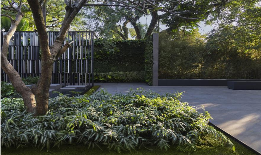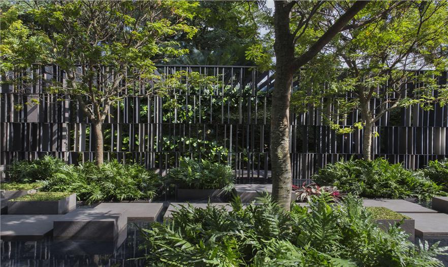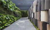 面積約450平方米的場地成為互動和沉思的花園,帶給人強烈的感官刺激?;▓@入口是一個走廊區(qū)域,頂部為光滑的金屬涼棚,一側(cè)是由本地?zé)釒е参锝M成的垂直綠化,另一側(cè)為錯落排列的遮陽板,從間隙中可以觀賞花園景色。走廊利用微妙的自然光線,營造出神秘氛圍,讓人期待走到它的盡頭看到花園的全景。