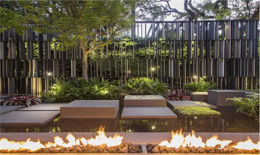 花園中心有一個寬廣的鏡面池,鋪有由陶瓷廢料制成的黑色石塊,這些石塊是制造商專門為這個項目開發(fā)的。水中的踏步吸引訪客近距離觀察鏡面池中心的“島嶼”和生態(tài)火堆。
