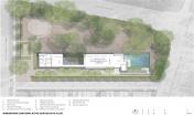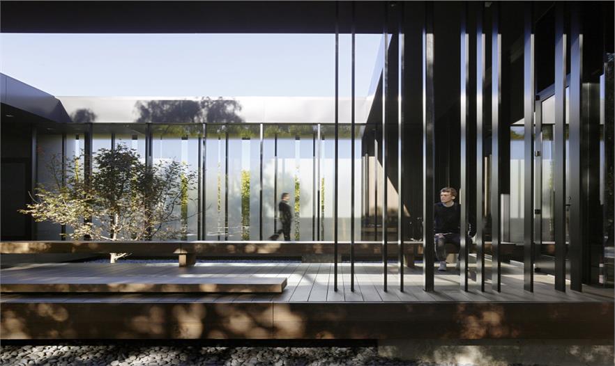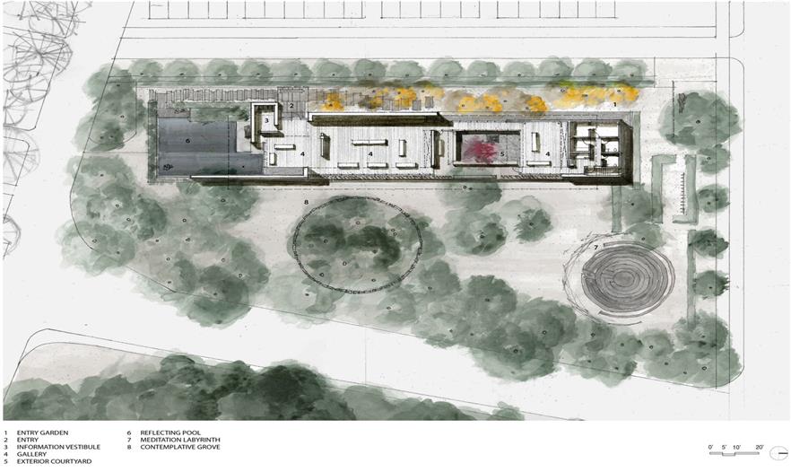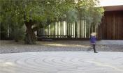 這個占地一英畝的狹長建筑物,被校園主要道路、繁忙的自行車道和大型宿舍所圍繞。精心安排的入口空間實現(xiàn)了從繁忙校園到教堂式畫廊的過渡,且體驗極為豐富:碎石小路引領(lǐng)訪客走過銀杏林,穿過一道高高的竹墻,使他們在進入冥想中心之前,忘卻外面的世界。建筑內(nèi)部空間與安靜沉思的室外空間相融合,寬闊的玻璃窗和極細的豎直邊框?qū)⒁暰€引導(dǎo)至林地和庭院。在建筑物的后部,由夯土墻圍合的鏡面池、銹蝕的鋼屏和竹墻屏蔽了周圍的喧囂,將訪客的注意力轉(zhuǎn)移到身邊每一個稍縱即逝的瞬間。在建筑中心,充滿禪意的庭院向天空和相鄰的橡樹林延伸,在這里可以看到坐落在樹林之間的冥想迷宮。