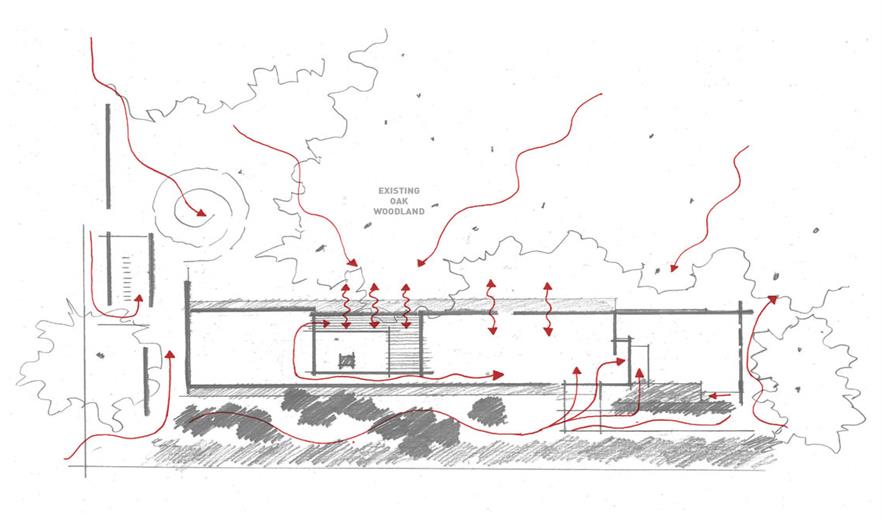 場地的獨特生態(tài)環(huán)境也對項目產(chǎn)生了重要影響。毗鄰的橡木林是蠑螈棲息地,在施工期間得到了小心的保護。此外,場地內(nèi)包含多株原生橡樹、加利福尼亞胡椒樹,以及學(xué)校中唯一的苦楝樹,團隊堅持圍繞這一敏感生態(tài)系統(tǒng)設(shè)計和定位建筑元素。以低耗水量和低維護品種為主的種植設(shè)計體現(xiàn)了可持續(xù)發(fā)展原則。