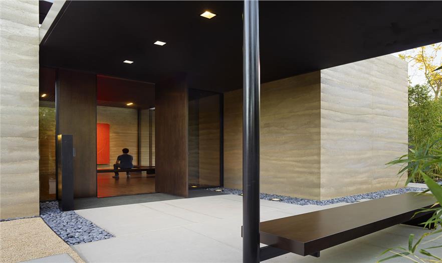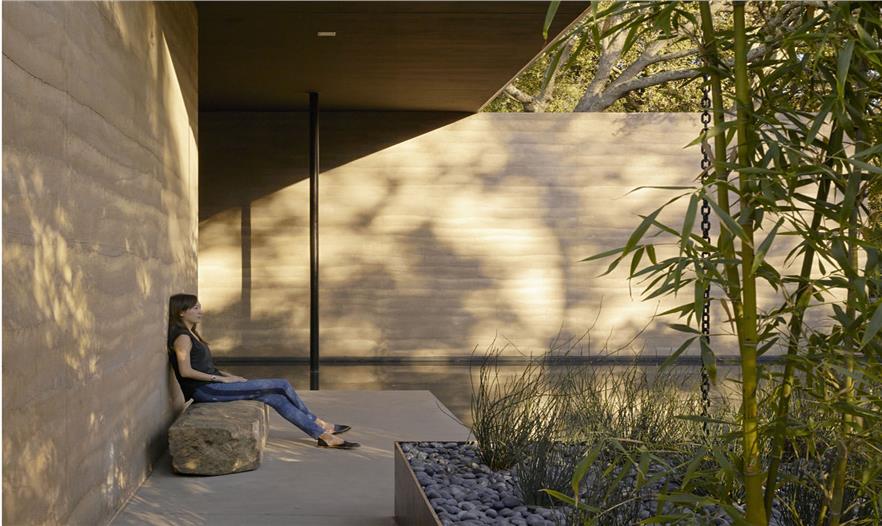 從一開始,建筑師和景觀設(shè)計師就充分考慮整合建筑結(jié)構(gòu)與景觀,這一理念貫穿項目各個方面。首先是建筑的選址。從靠近街道的入口處看去,建筑物若隱若現(xiàn)。而當(dāng)訪客走過銹蝕的鋼屏,從街道進入冥想中心時,忽然開始有了進入神圣空間的感受。在正門一側(cè),建筑與景觀相互融合,視覺上消解了場地東西方向4英尺的高差。長線性的建筑順著略為傾斜的地形延伸,直到在另一端與大地相連。坡度變化雖然微乎其微,卻有效塑造了逐漸沉入冥想與反思的空間體驗。