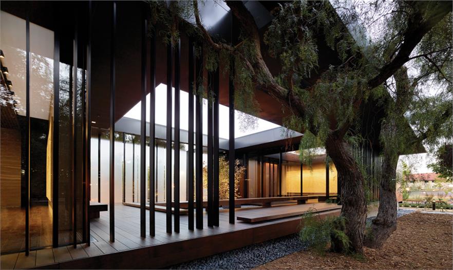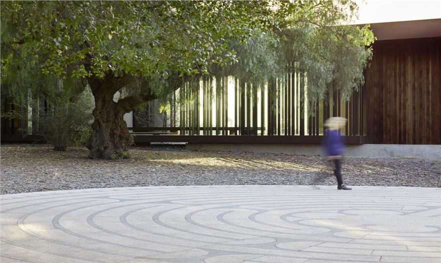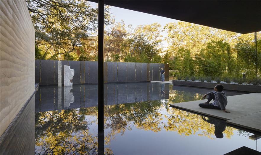 斯坦福大學(xué)繁忙的校園給項目帶來獨特的挑戰(zhàn)。為塑造隱私感,需要在視覺上屏蔽相鄰街道、自行車路道和宿舍樓的打擾。設(shè)計團隊采用相應(yīng)策略,既確??臻g圍合,又留有視線通達性,實現(xiàn)了隱私需要與校園安全之間的平衡。植物種植留有縫隙,保持一定的開放度和可見度,使訪客在冥想中心無論何時都能感到安全。鑒于校園的居住性質(zhì),設(shè)計團隊還需要考慮景觀庭院的夜間使用。即使建筑物關(guān)閉,學(xué)生也可以在中心內(nèi)觀看繪畫,同時享受沉思空間和自然環(huán)境。