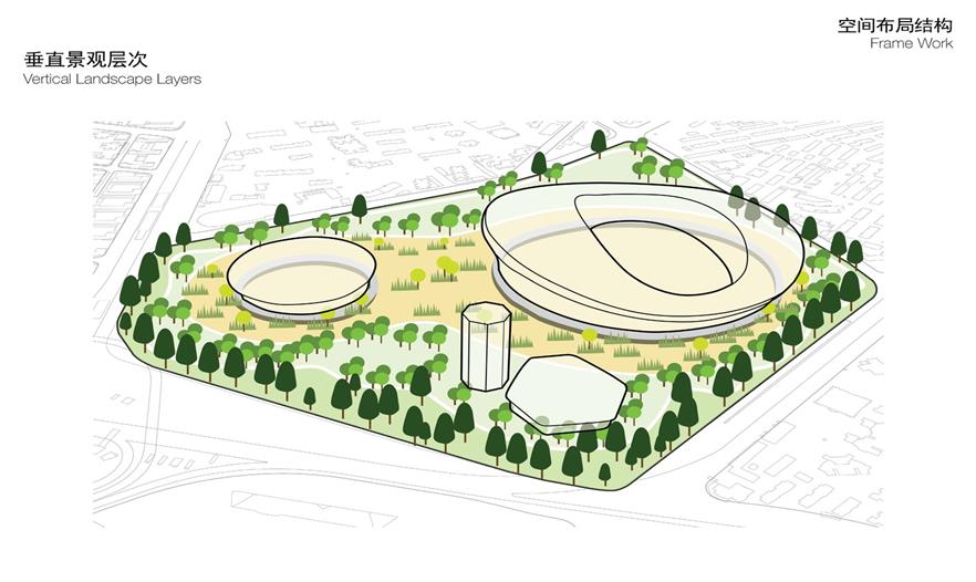 將專業(yè)賽事與大眾體育兩大主題進行分區(qū),保留現(xiàn)有兩大場館的主布局,強化與西面華庭賓館的空間軸,形成東西向的“專業(yè)賽事軸”,保留了本土的城市空間記憶。