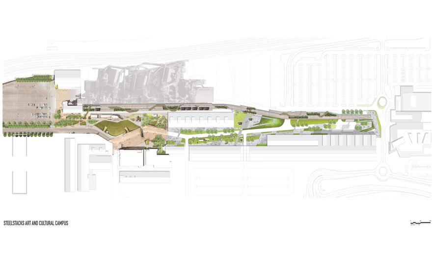 項(xiàng)目進(jìn)行的關(guān)鍵性改造之一在于穿過(guò)園區(qū)的道路設(shè)計(jì),為容納2500人的Levitt露天劇院提供了空間,使其得以坐落于創(chuàng)始人大道的主軸線(xiàn)上,這條道路是從城區(qū)進(jìn)入園區(qū)的主要入口。這樣在創(chuàng)造獨(dú)特游歷體驗(yàn)的同時(shí),使SteelStacks高爐成為引人注目的背景。新增設(shè)的Hoover-Mason高架廊道則為游客提供了絕佳的俯瞰點(diǎn),將人們的視線(xiàn)導(dǎo)向園區(qū)周?chē)匾臍v史和環(huán)境要素。