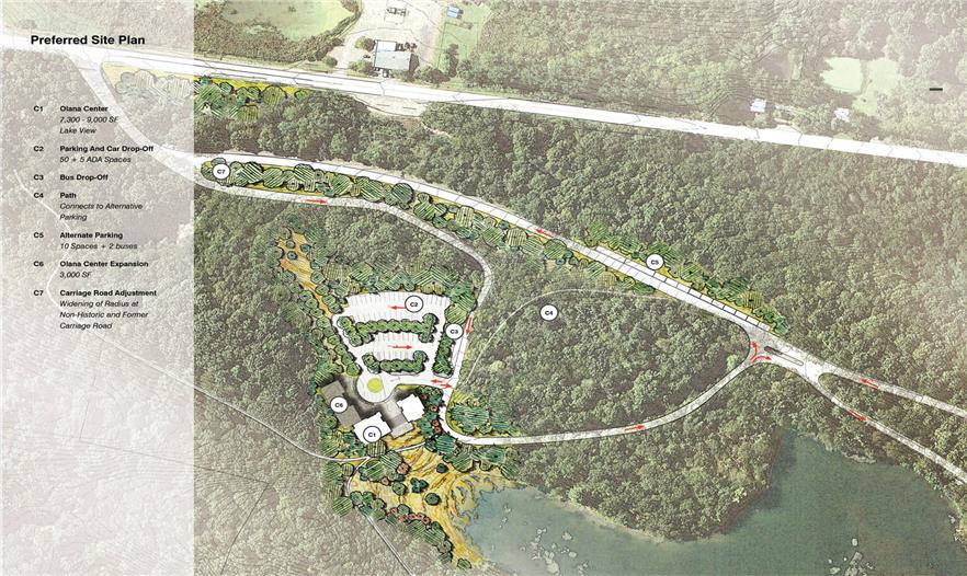 奧拉納原有的游客中心位于車房,緊鄰主要住宅。戰(zhàn)略設(shè)計(jì)提出將游客中心搬遷到新的奧拉納中心,在游客尚未進(jìn)入歷史核心區(qū)時(shí)就提前開(kāi)始體驗(yàn)過(guò)程。新奧拉納中心向游客展示景觀全貌,包括馬車道、湖泊、森林和草地。徒步游線從這里出發(fā),其中短途游線將帶領(lǐng)游客沿著馬車道來(lái)到皇冠山和湖泊周邊,而長(zhǎng)途游線一般圍繞農(nóng)場(chǎng)展開(kāi)。自助游線中游客可以穿過(guò)林地,在奧拉納境內(nèi)多處風(fēng)景如畫(huà)的地點(diǎn)開(kāi)展野餐活動(dòng),食物購(gòu)買(mǎi)十分方便。奧拉納中心將介紹丘奇和奧拉納的歷史,在參觀主要住宅的基礎(chǔ)上,提供一系列多樣的游線選擇方案。