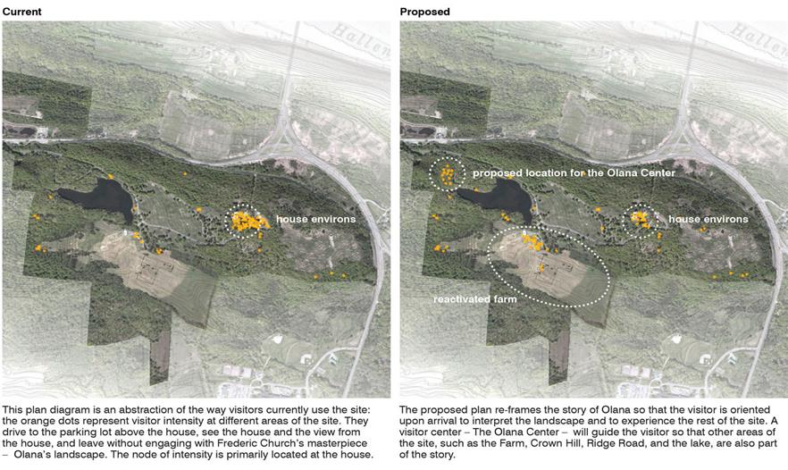 奧拉納州級(jí)歷史遺址坐落于哈德遜山谷,占地250英畝,著名哈德遜河畫(huà)派畫(huà)家弗雷德里克·丘奇曾在此居住、工作,并以這里的風(fēng)景為主題繪制風(fēng)景畫(huà),因此該遺址也被認(rèn)為是丘奇最偉大的藝術(shù)作品之一。紐約州公園、娛樂(lè)和歷史保護(hù)辦公室(NYSOPRHP)與The Olana Partnership(TOP)機(jī)構(gòu)合作,委托景觀設(shè)計(jì)師對(duì)奧拉納進(jìn)行程序性、操作性和生態(tài)性評(píng)估。由此產(chǎn)生的景觀戰(zhàn)略性設(shè)計(jì)中,制定了激活住宅、景觀以及哈德遜山谷歷史關(guān)系的方案。它界定了三大主要干預(yù)領(lǐng)域,針對(duì)整個(gè)場(chǎng)地提出建議項(xiàng)目,并進(jìn)行市場(chǎng)和財(cái)務(wù)可行性分析。針對(duì)甲方提出加深游客參與度、提高游客人數(shù)的需求,方案?jìng)?cè)重于增加游客量和提供教育機(jī)會(huì)。方案的基本愿景是,重新建立奧拉納這一丘奇親自設(shè)計(jì)的住宅與景觀的整體體驗(yàn)。