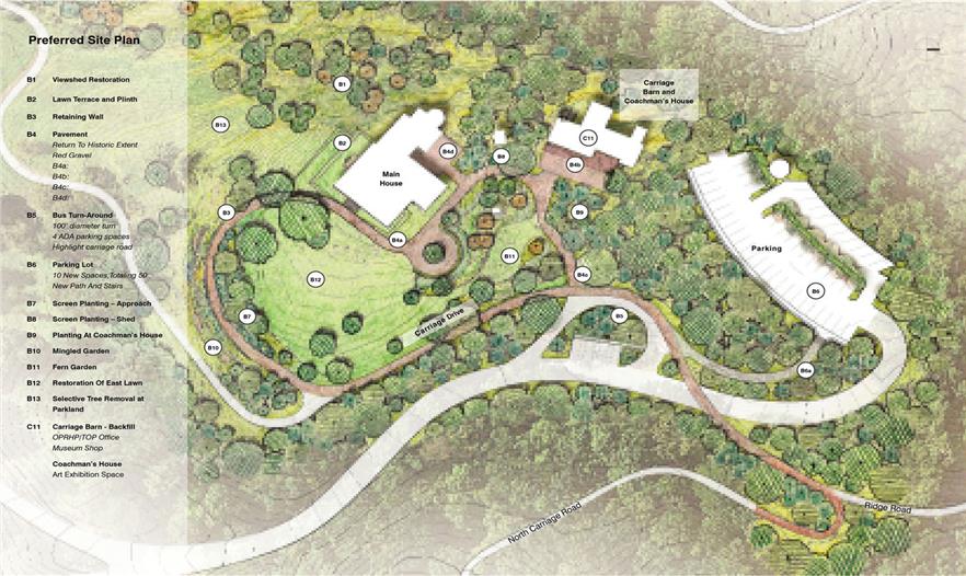 場(chǎng)地整體建議包含修復(fù)馬車道系統(tǒng)和林地項(xiàng)目。在丘奇設(shè)計(jì)的馬車道上景觀逐漸展開(kāi),通過(guò)控制視線的可達(dá)范圍,創(chuàng)造出步移景異的效果。景觀設(shè)計(jì)師提議恢復(fù)馬車道系統(tǒng),借此充實(shí)整體環(huán)境體驗(yàn)。林地項(xiàng)目包括種植設(shè)計(jì)以及一份更為詳盡的方案,最大限度重現(xiàn)丘奇時(shí)代林地與草坪的平衡。當(dāng)前林地缺乏林下層植被,因此外來(lái)植物和鹿群的管理計(jì)劃對(duì)修復(fù)工作也至關(guān)重要。