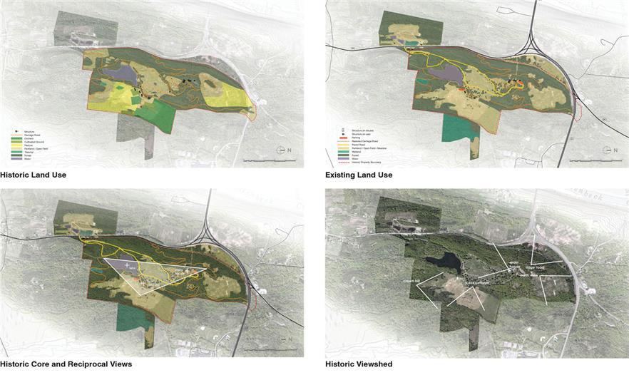 景觀戰(zhàn)略性設(shè)計(jì)的過(guò)程充分參考了歷史性文件(照片、信件、過(guò)去的歷史和規(guī)劃報(bào)告等),現(xiàn)場(chǎng)調(diào)查,以及The Olana Partnership和紐約州公園、娛樂(lè)和歷史保護(hù)辦公室代表的意見(jiàn)。項(xiàng)目團(tuán)隊(duì)對(duì)奧拉納地產(chǎn)及其周邊環(huán)境進(jìn)行地理空間分析,借助紐約州和國(guó)家機(jī)構(gòu)提供的地理信息系統(tǒng)(GIS)數(shù)據(jù),繪制場(chǎng)地現(xiàn)狀、土地利用、歷史土地利用、邊界、水文、土壤和坡度圖表。