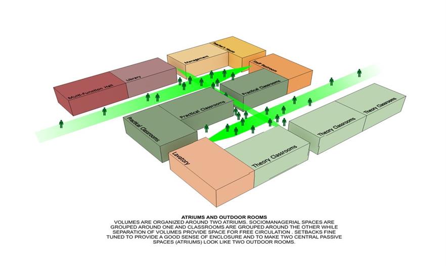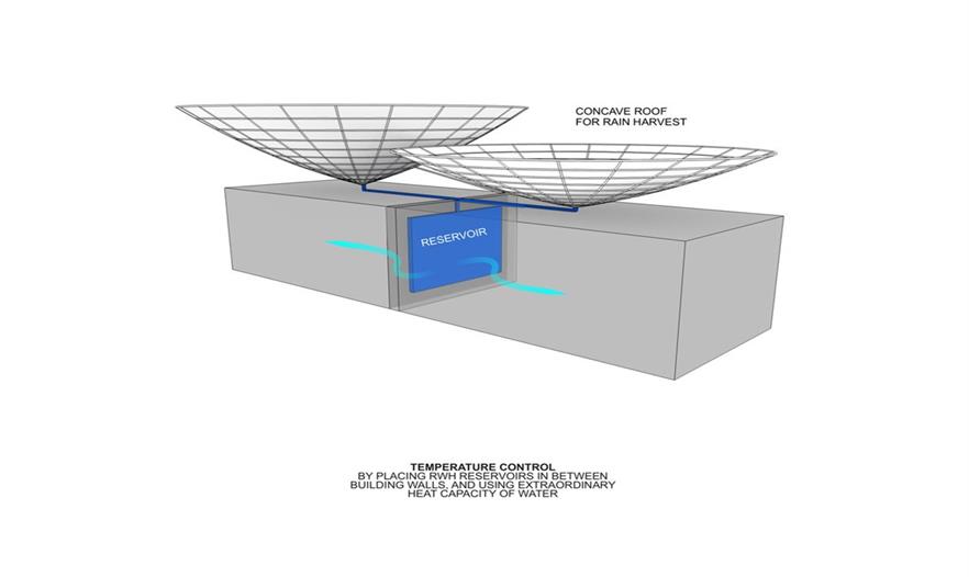 雨水將被儲(chǔ)存在水箱中,與收集系統(tǒng)相連,安裝在建筑墻壁之間——這個(gè)設(shè)計(jì)將會(huì)控制室內(nèi)空間的溫度,幫助降低艱難環(huán)境下使用空調(diào)留下的碳足跡。