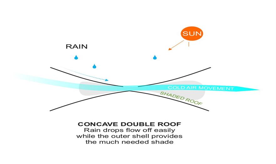 最近,BM Design Studios事務(wù)所公布了雙屋頂系統(tǒng),碗狀結(jié)構(gòu),用于雨水收集。鑒于該區(qū)域降水少,不到世界平均值的三分之一,蒸發(fā)率比世界平均值要高三倍,凹型屋頂系統(tǒng)會(huì)是一種有效地收集方法,即使是最少量的降水。