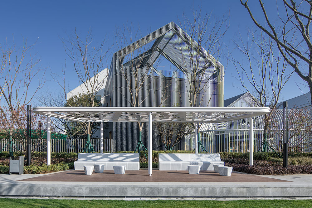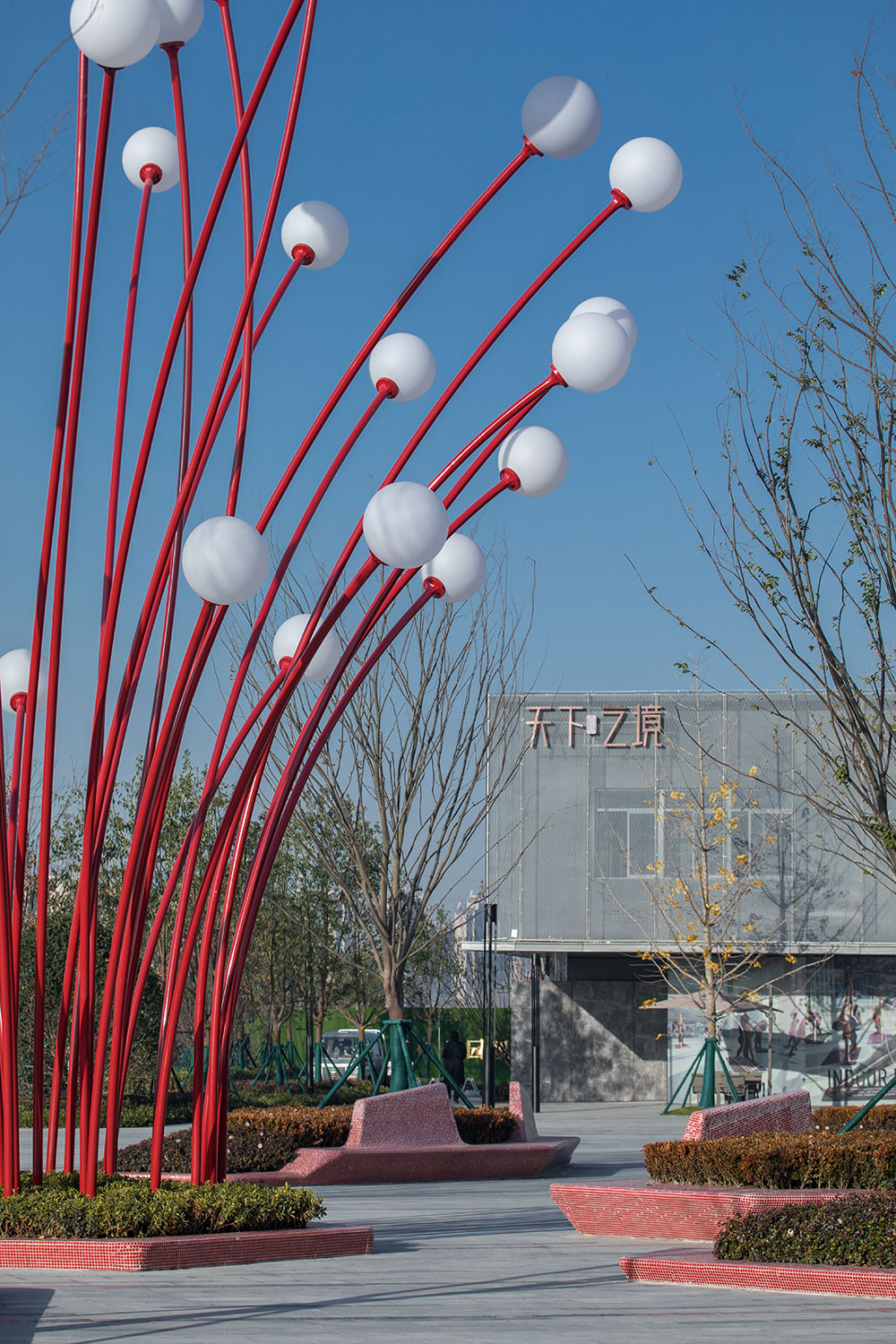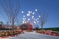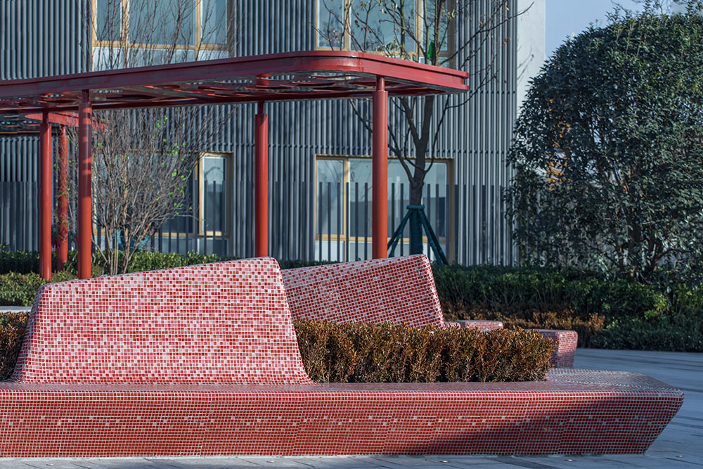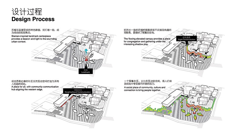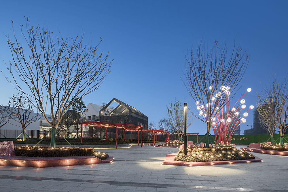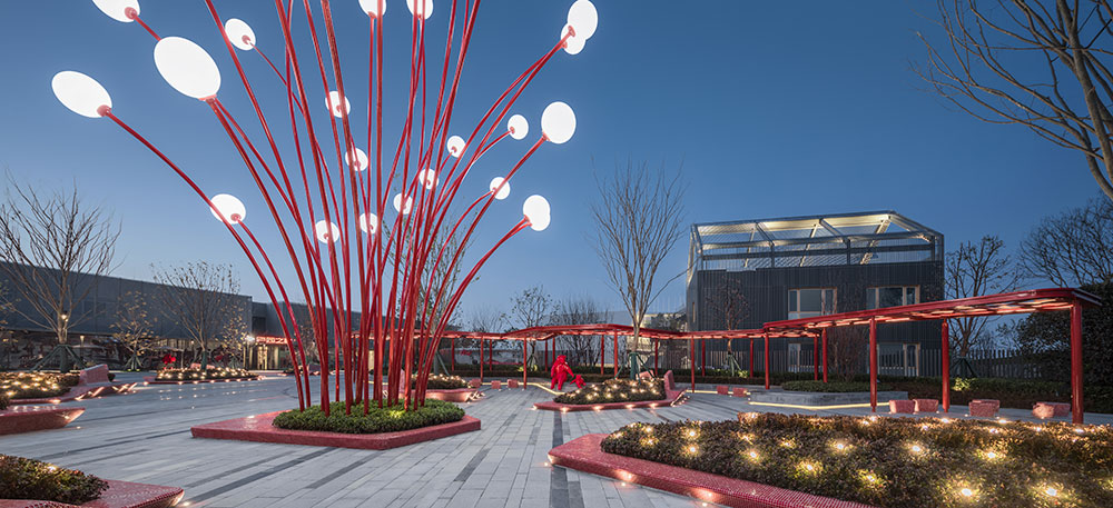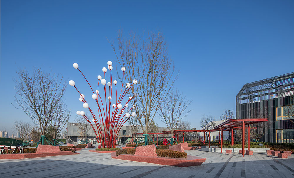 整體設計與當地社區(qū)和文化相呼應,將合肥市鮮活且極具有代表性的市花——石榴花——作為靈感的起源,并結合其花形式、色彩和石榴果實的元素創(chuàng)造出有活力、色彩豐富、大膽創(chuàng)新的體驗。在通過融合以社交、人群活力為重點的景觀空間劃分,滿足社區(qū)和人群需求,鼓勵人們之間的互動和交流。