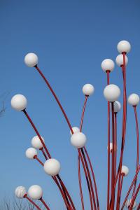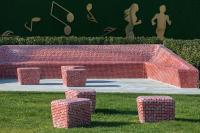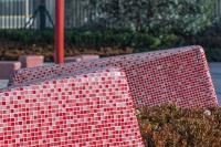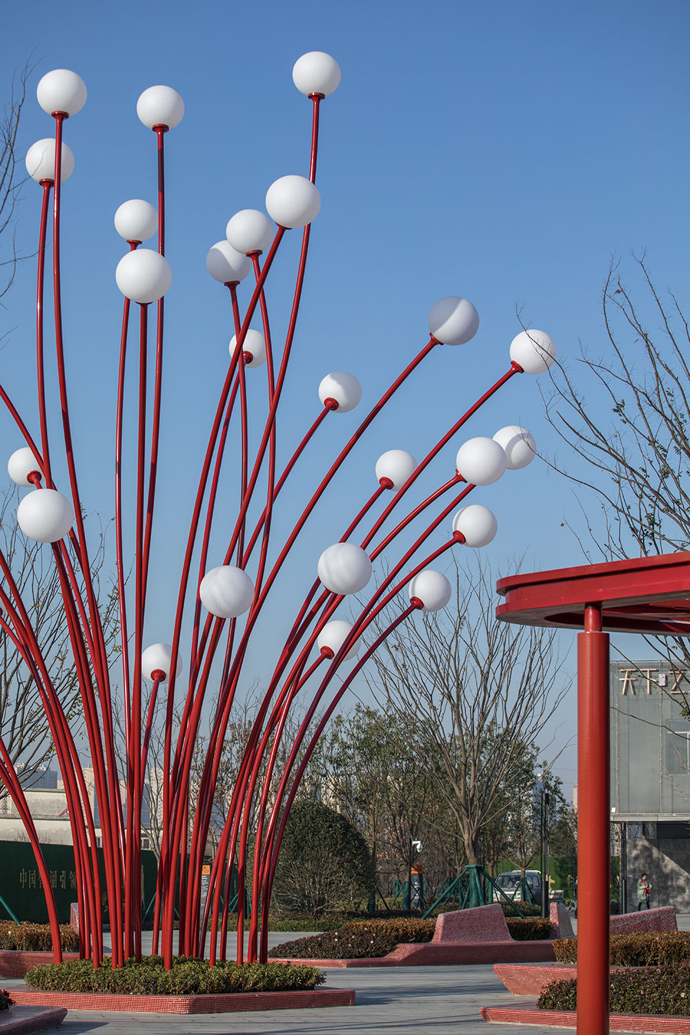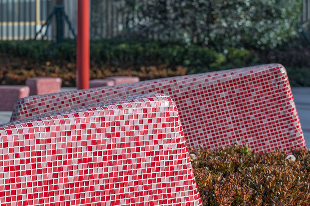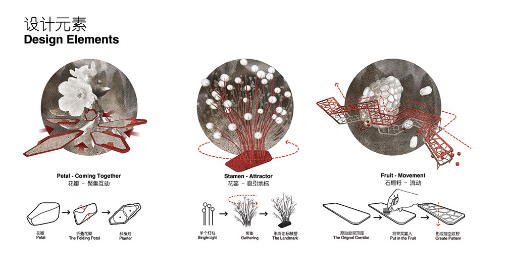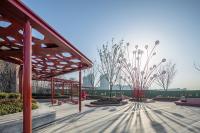 口袋公園中心的雕塑以石榴花蕊為形,高大佇立在廣場中,成為場地和周邊難忘的地標。象征著風的鋪裝和以風中飄落花瓣為形的定制種植池和活力座椅相結合,通過不同組合排列,為人們創(chuàng)造一處休憩、停留和享受的舒適、恬靜空間。石榴籽的獨特排列被抽象提取并演化成為廊架元素,透著光在地面上形成趣味十足的光影體驗,更為人們在夏日休憩提供了陰涼適宜的空間。