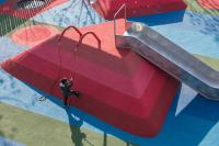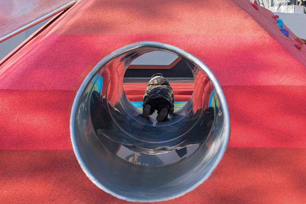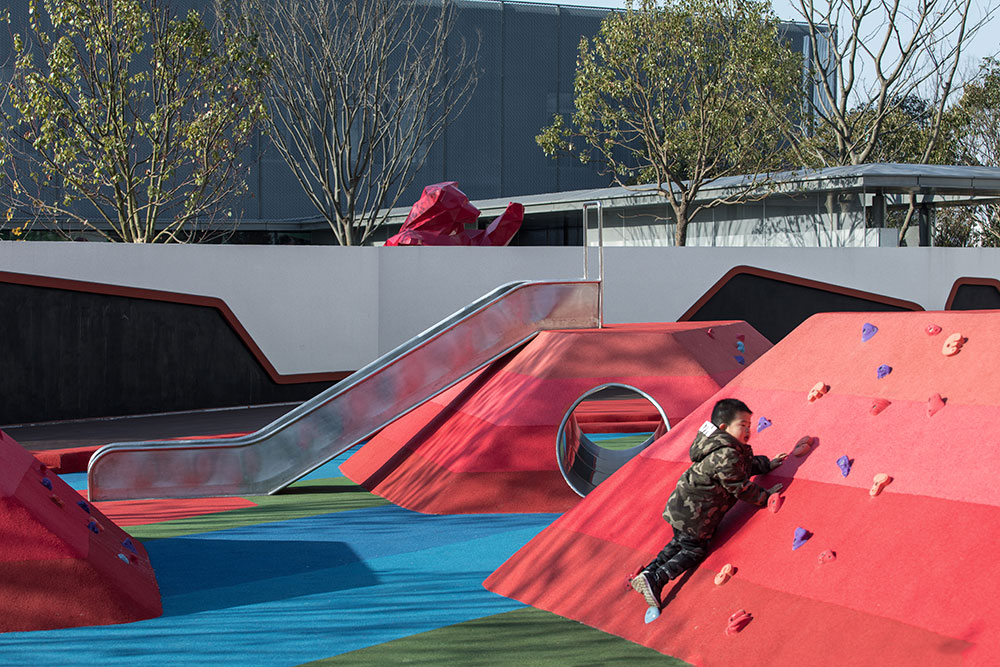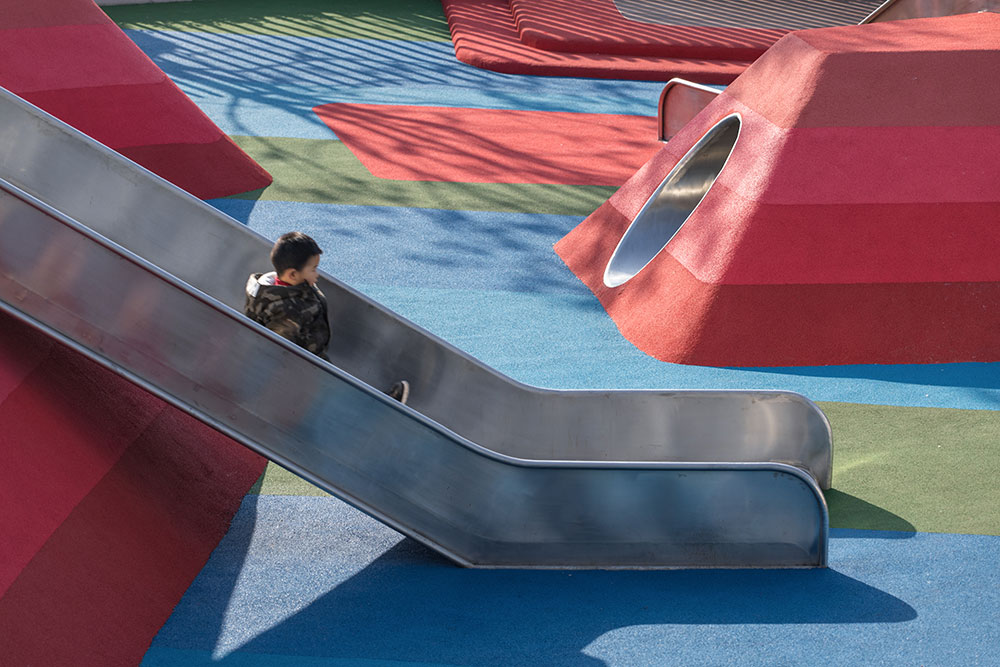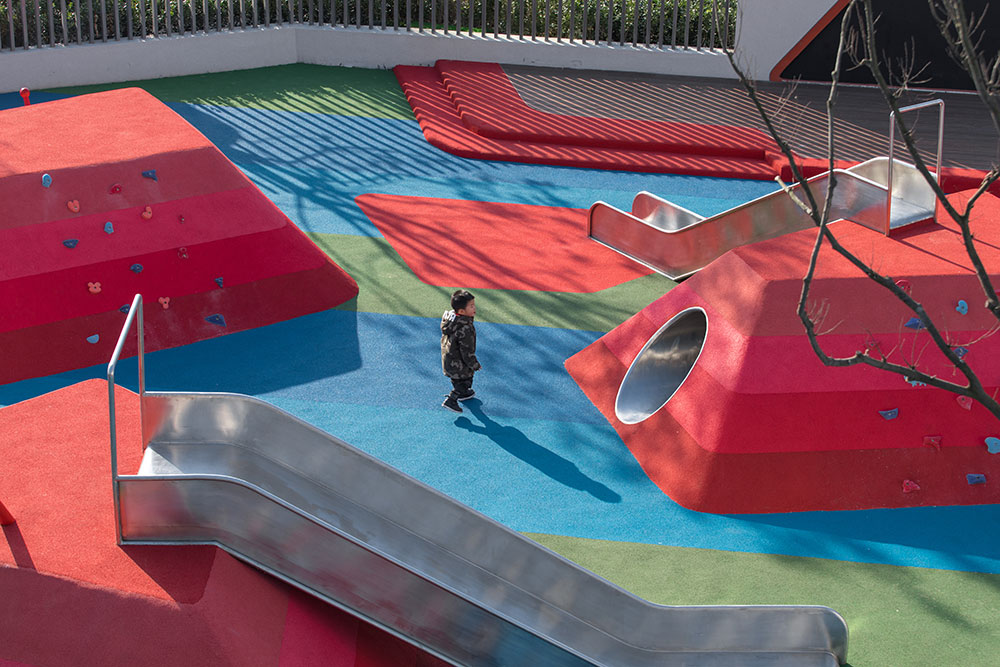 兒童游樂區(qū)為孩子們提供了一處體驗多樣游樂和學習的場地。象征著河流和森林的藍綠相間的地鋪上,是漸變色調模仿石層變化的地形山丘。通過結合互動游樂設施、戲水池、沙池,設置自由游樂和固定游樂設施,游樂設計讓孩子可以聚集一起在這里自由玩耍、奔跑、學習和社交,鍛煉他們社交能力、提高身體素質、感受樂趣和挑戰(zhàn)。